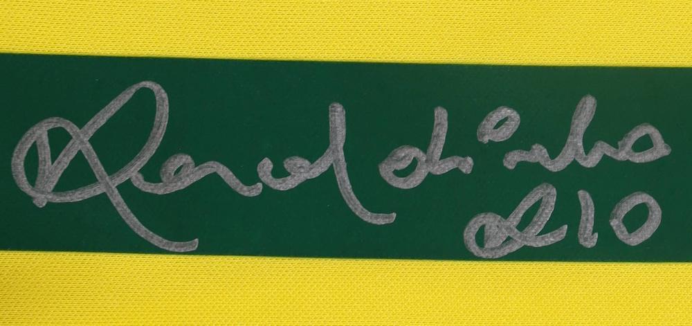 Nike jersey with everything pressed on, size L. Hand-signed by Ronaldinho.