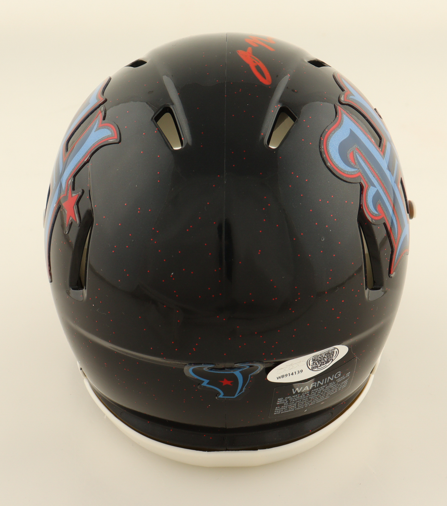 Riddell Houston Texans Speed Mini Helmet. Hand-signed by Jaylin Noel. Please note the signature is smudged.