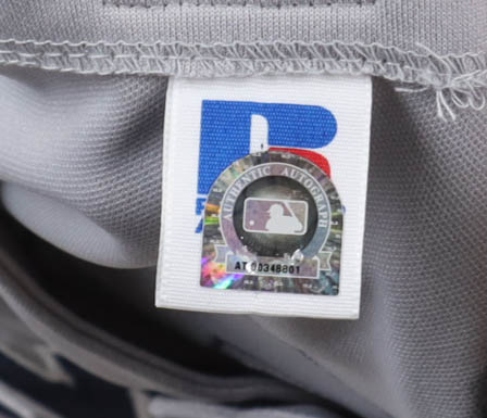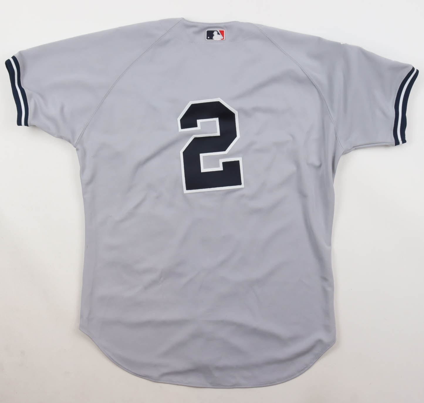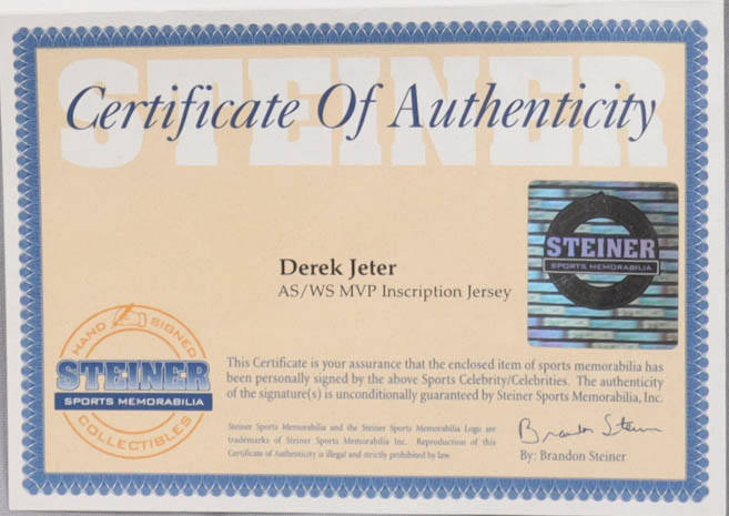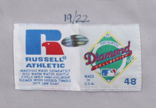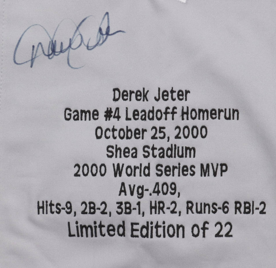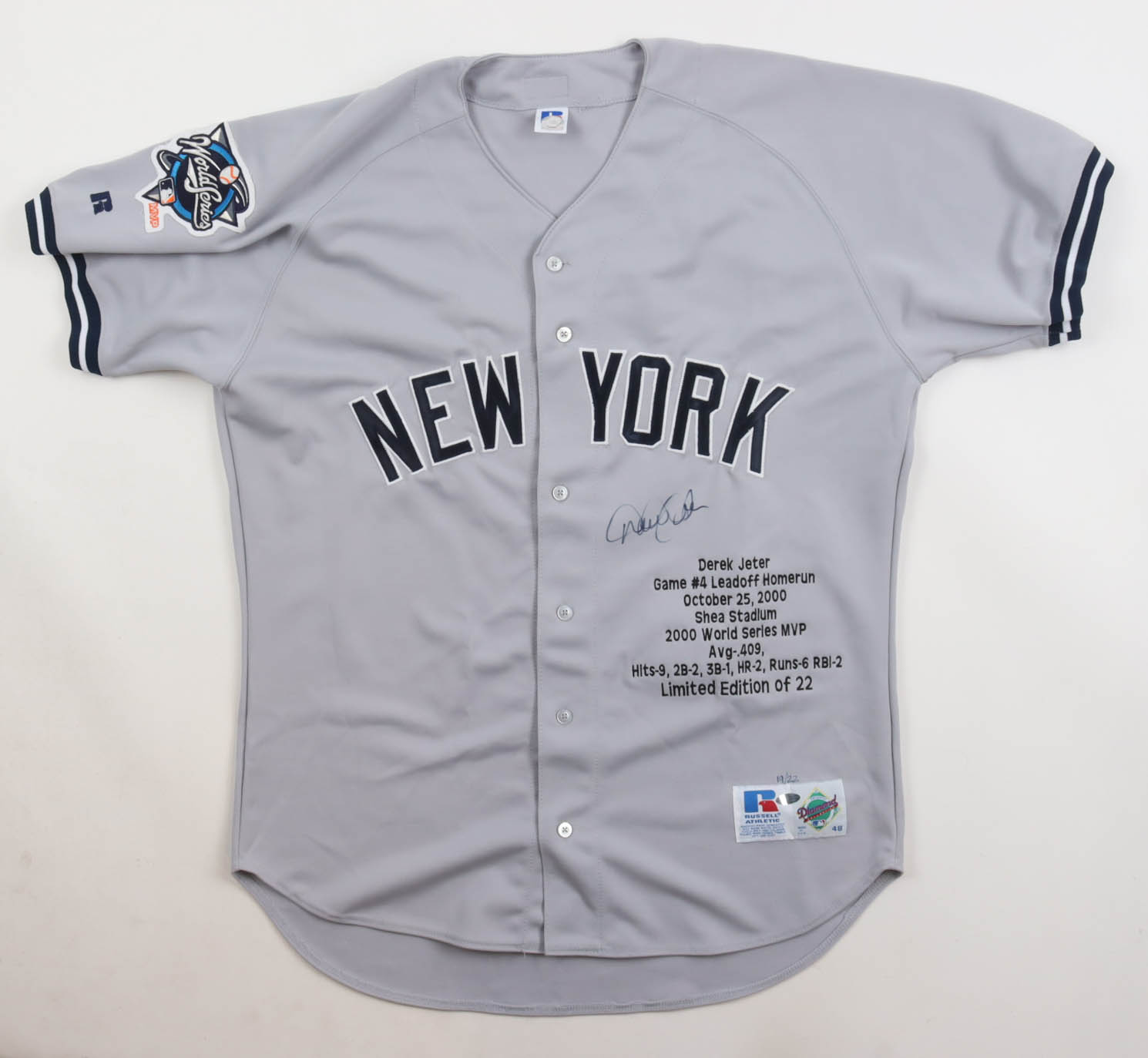 Russel Athletic authentic jersey with everything sewn on, size 48. Hand-signed by Derek Jeter (New York Yankees). Jersey is hand-written limited edition #19/22. Please note, the jersey shows light stains throughout
