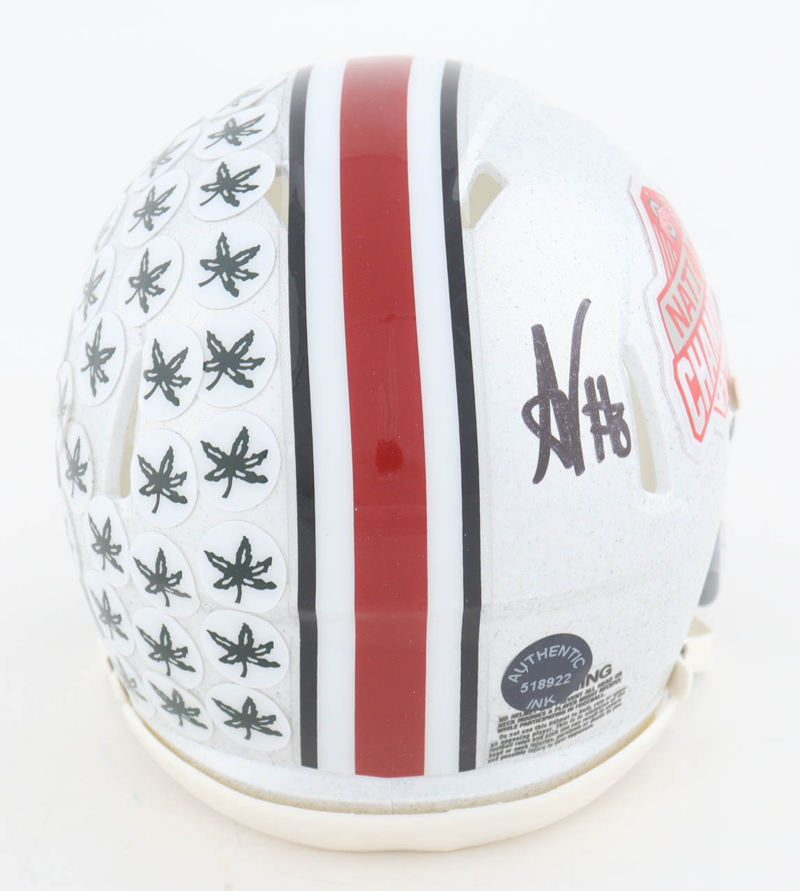 Riddell Ohio State Buckeyes 2024 National Champions logo mini helmet. Hand-signed by Arvell Reese.
