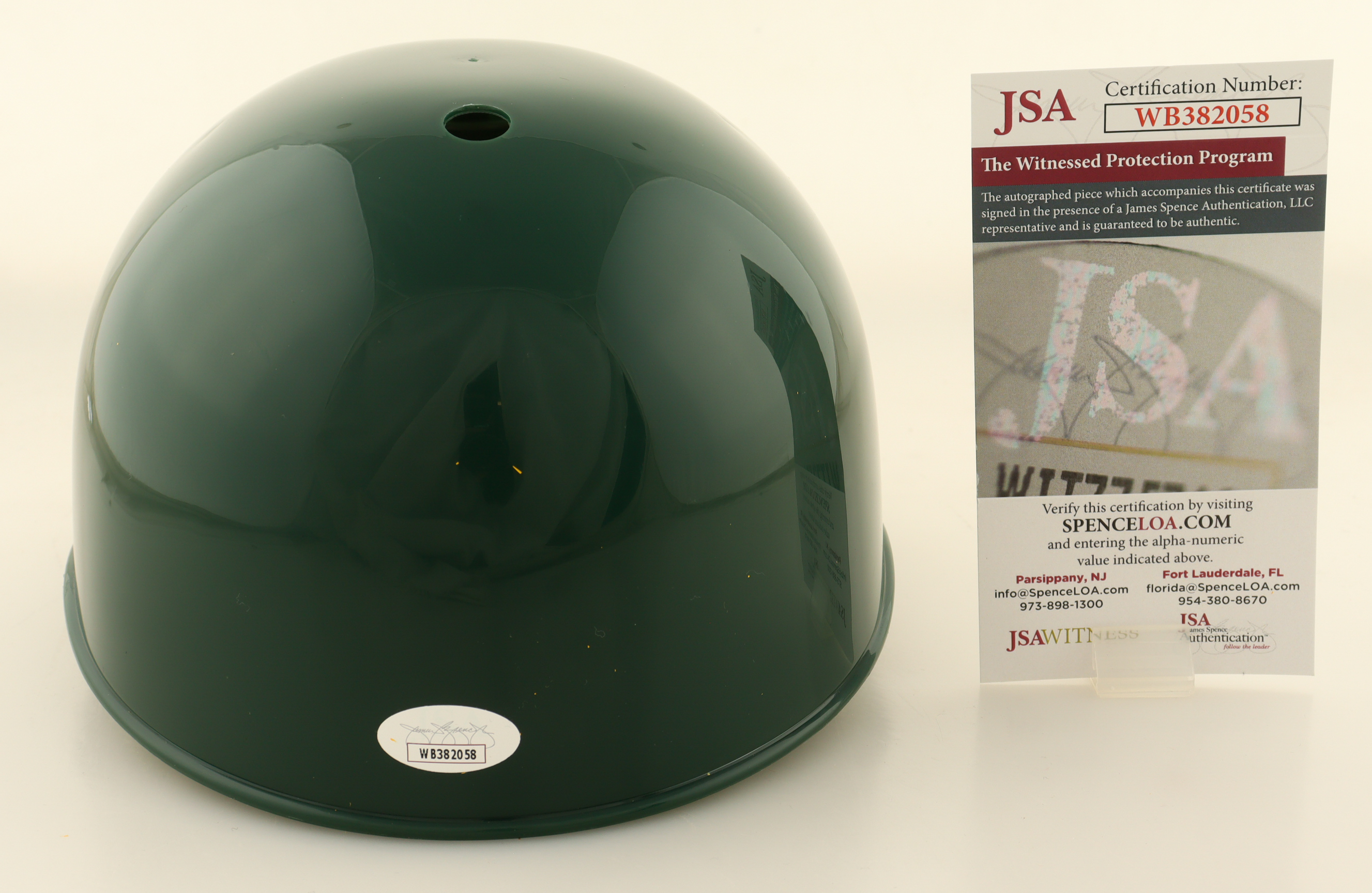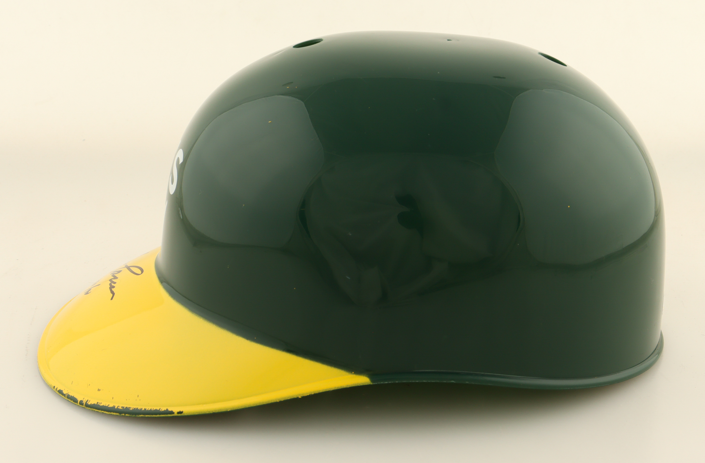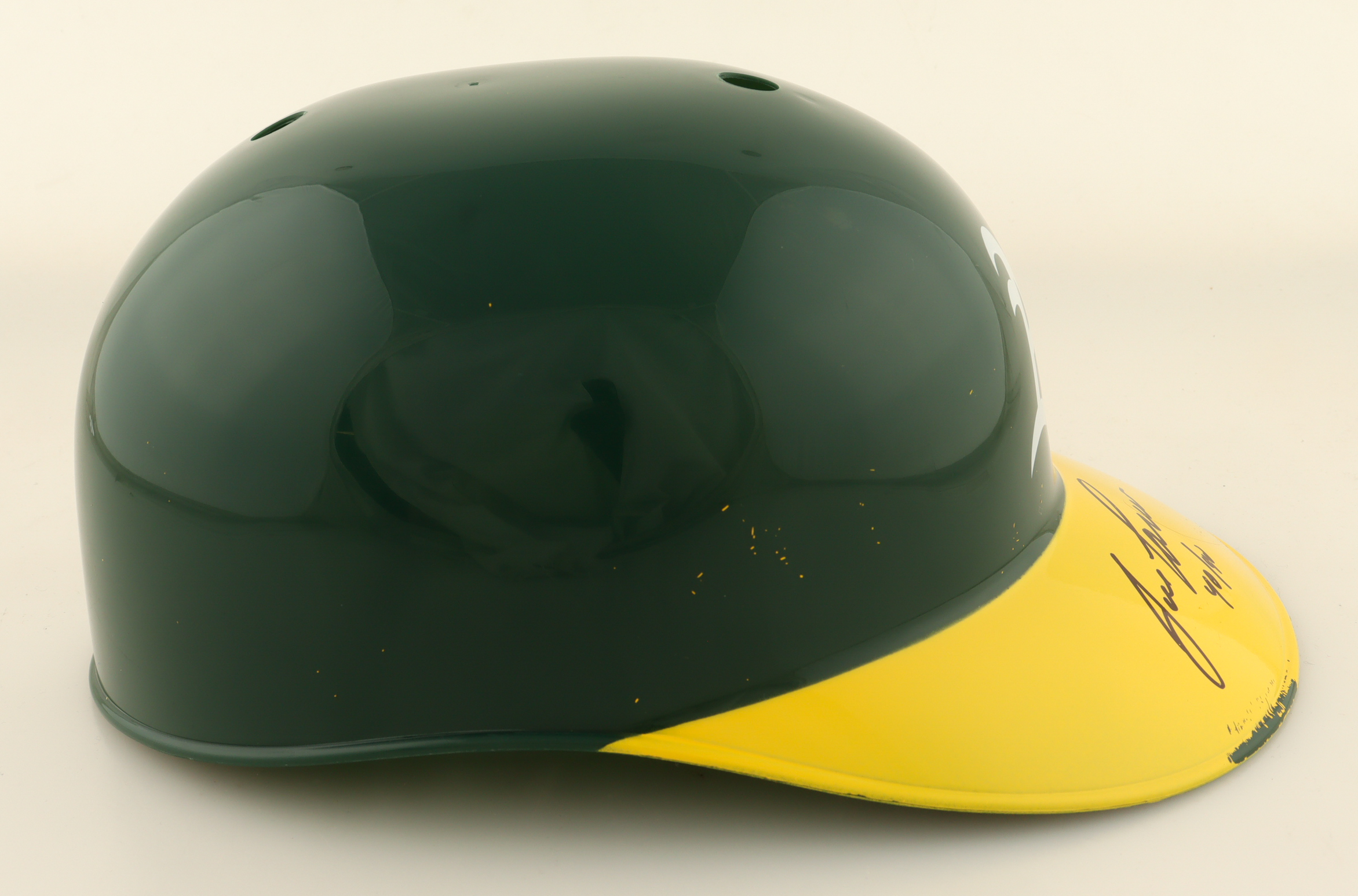 Oakland Athletics Full-Size Plastic Souvenir Replica Batting Helmet. Hand-signed and inscribed by Jose Canseco. Please note the brim is scuffed, see photos for more details.