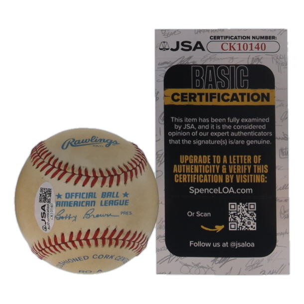 Rawlings Official American League baseball. Hand-signed by Hoyt Wilhelm (D. 2002, New York Giants, HOF). Please note, ball naturally toned and has staining.