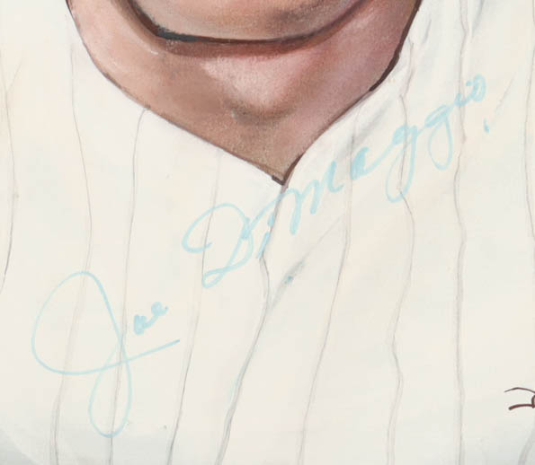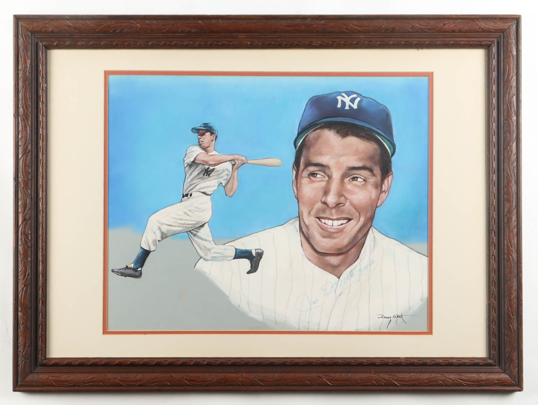 Custom frame measures approximately 23" x 31" in size and features a Doug West (D. 2012) art print hand-signed by Joe DiMaggio (D. 1999, New York Yankees, HOF).