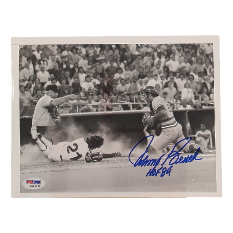 Photo measures 8" x 10" in size and has been hand signed and inscribed by Johnny Bench (Cincinnati Reds, HOF).