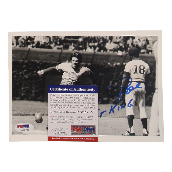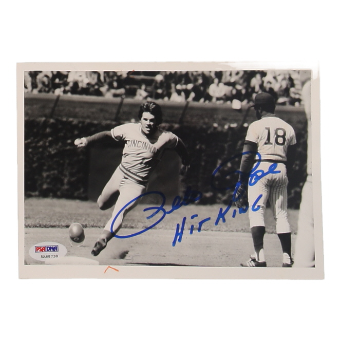 Photo measures approximately 6" x 8" in size. Hand-signed and inscribed by Pete Rose (D. 2024, Cincinnati Reds). Please note, there is a stray pen mark near the bottom of the photo.