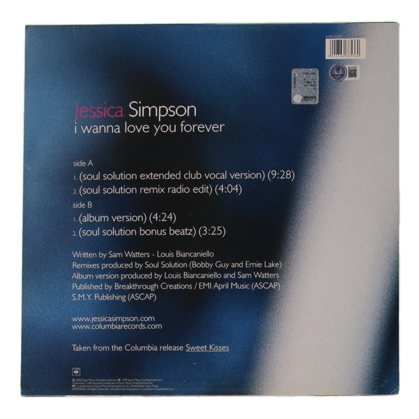 "I Wanna Love You Forever" Vinyl Album Cover has been hand-signed by Jessica Simpson. Please note, the vinyl record is included as shown. Please see photos for details regarding the condition of the album cover.