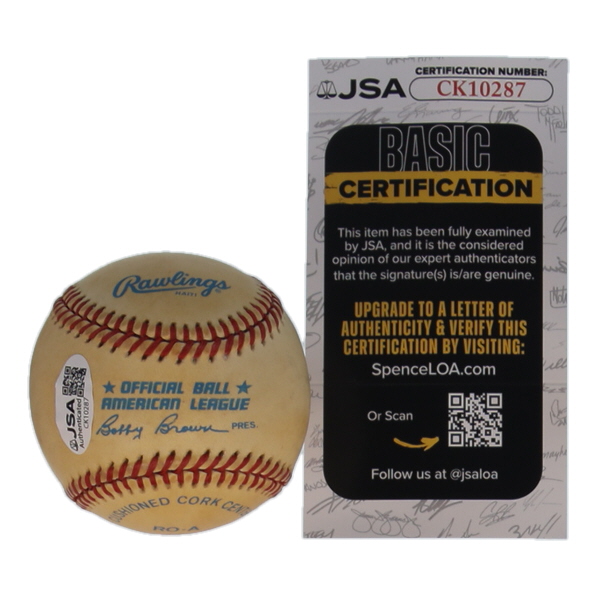 Rawlings Official American League Baseball. Hand-signed by Bob Lemon (D. 2000, Cleveland Indians, HOF). Please note, the baseball is naturally toning and stained.
