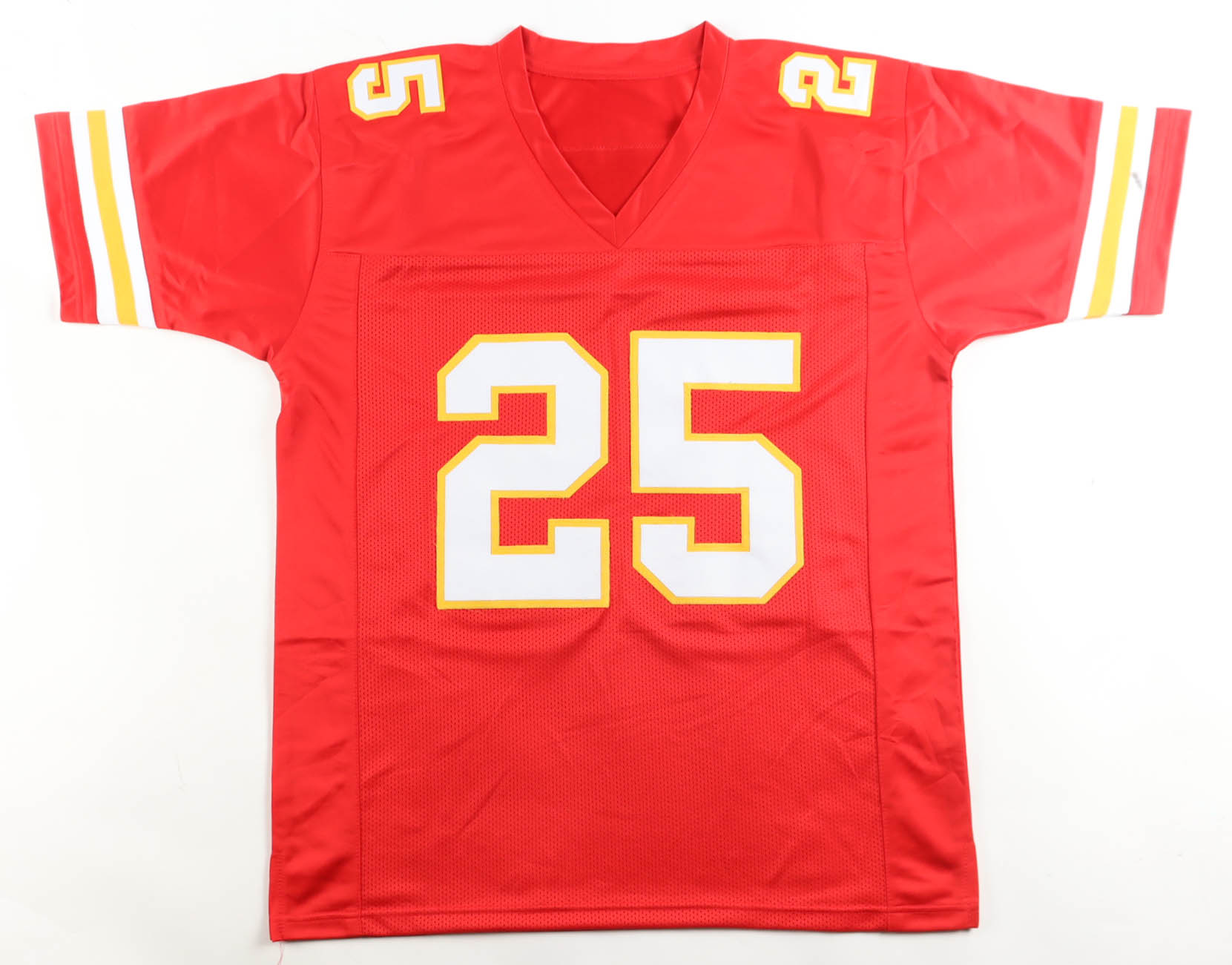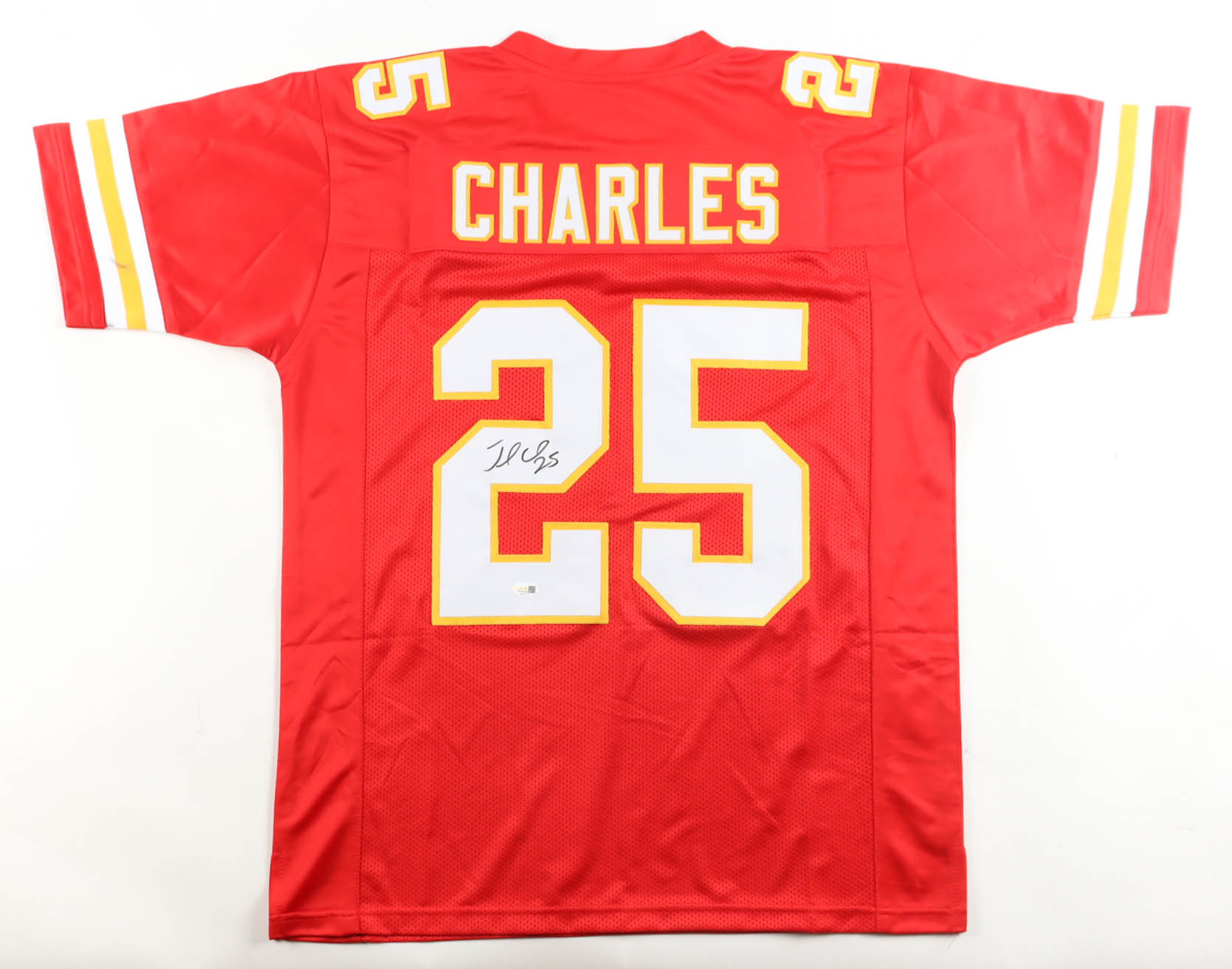 Custom jersey with everything sewn on, size XL. Hand-signed by Jamaal Charles. Please note, there is a stain on the left sleeve. See photos regarding the condition of the item.