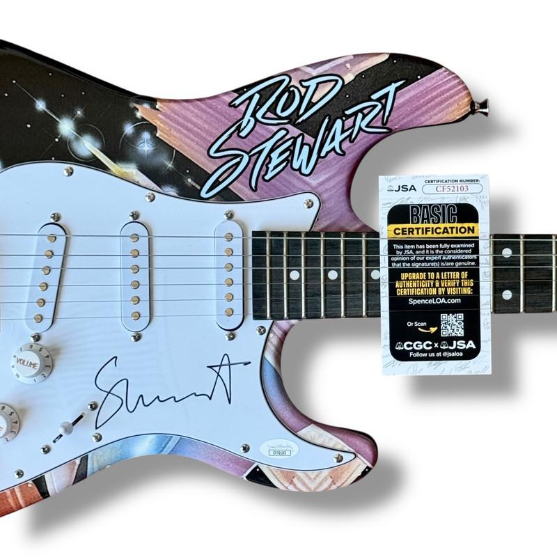 Custom Autograph Edition Stratocaster style electric guitar measures approximately 39" in length and has been hand-signed on the pickguard by Rod Stewart.