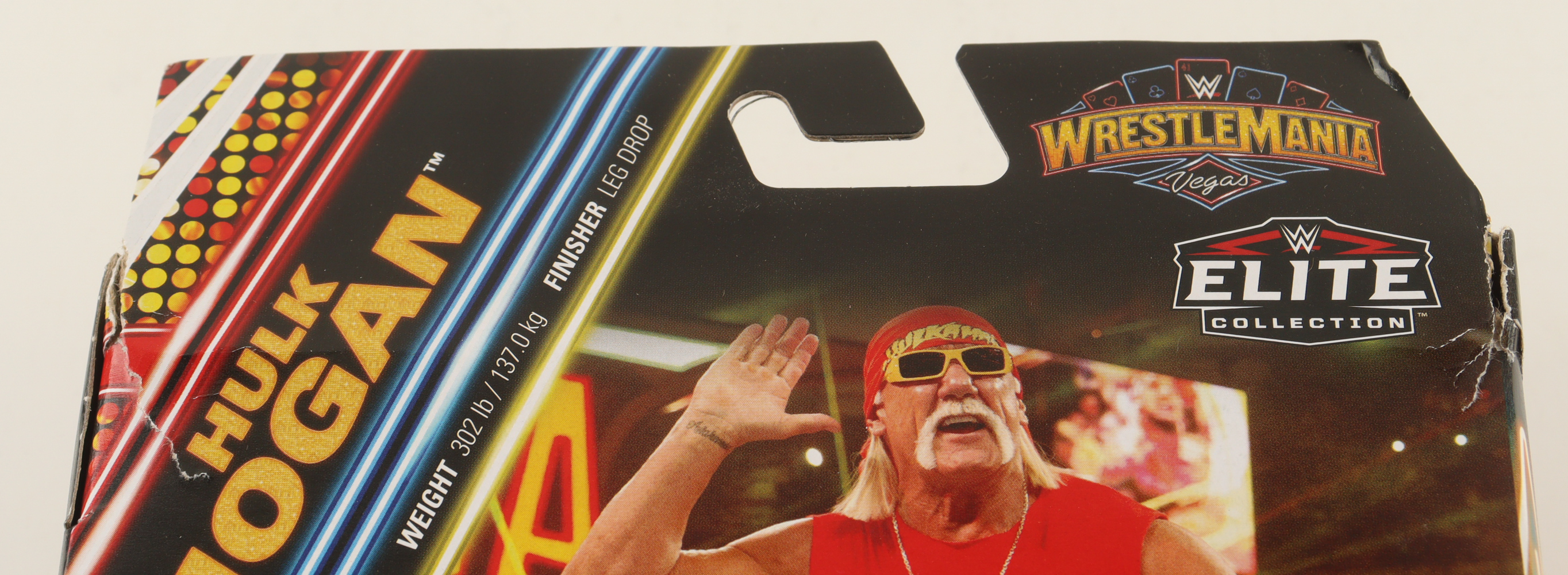 Mattel WWE WrestleMania Collection action figure. Hand-signed on the box by Hulk Hogan (HOF). Please note that the original packaging shows signs of damage.