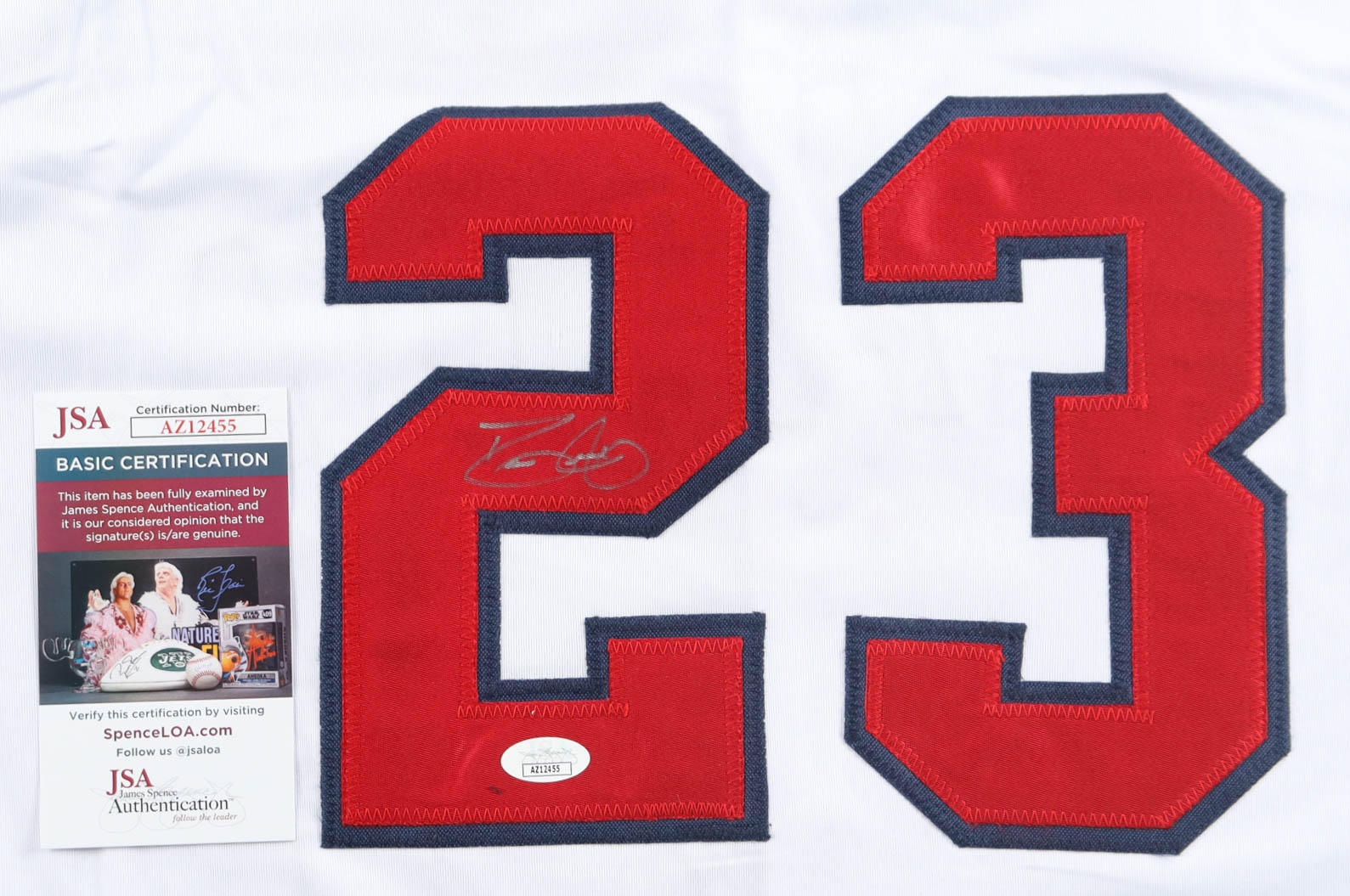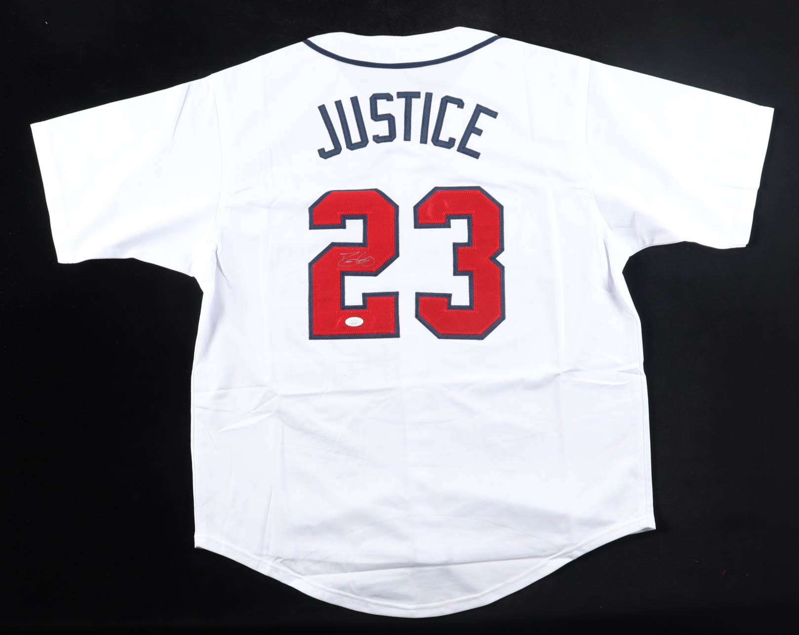 Custom jersey with everything sewn on, size XL. Hand-signed by David Justice.