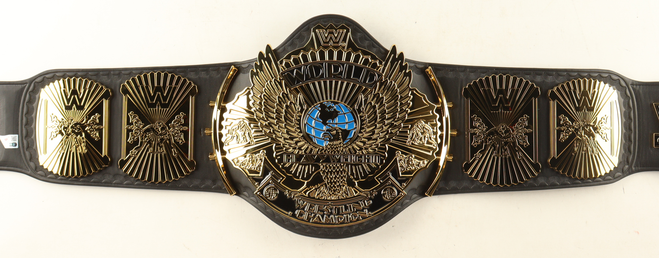 Official Replica WWE Winged Eagle championship belt measures 49" long and has been hand-signed by Bret Hart (HOF).