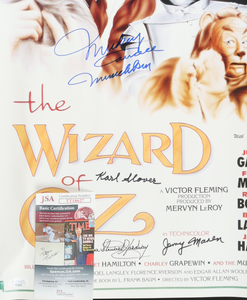 Poster measures approximately 16" x 24" in size and has been hand-signed and inscribed by Mickey Carroll (D. 2009), Jerry Maren (D. 2018), Karl Slover (D. 2011), and Donna Stewart Hardway (D. 2008). Please note, there are creases throughout the poster.