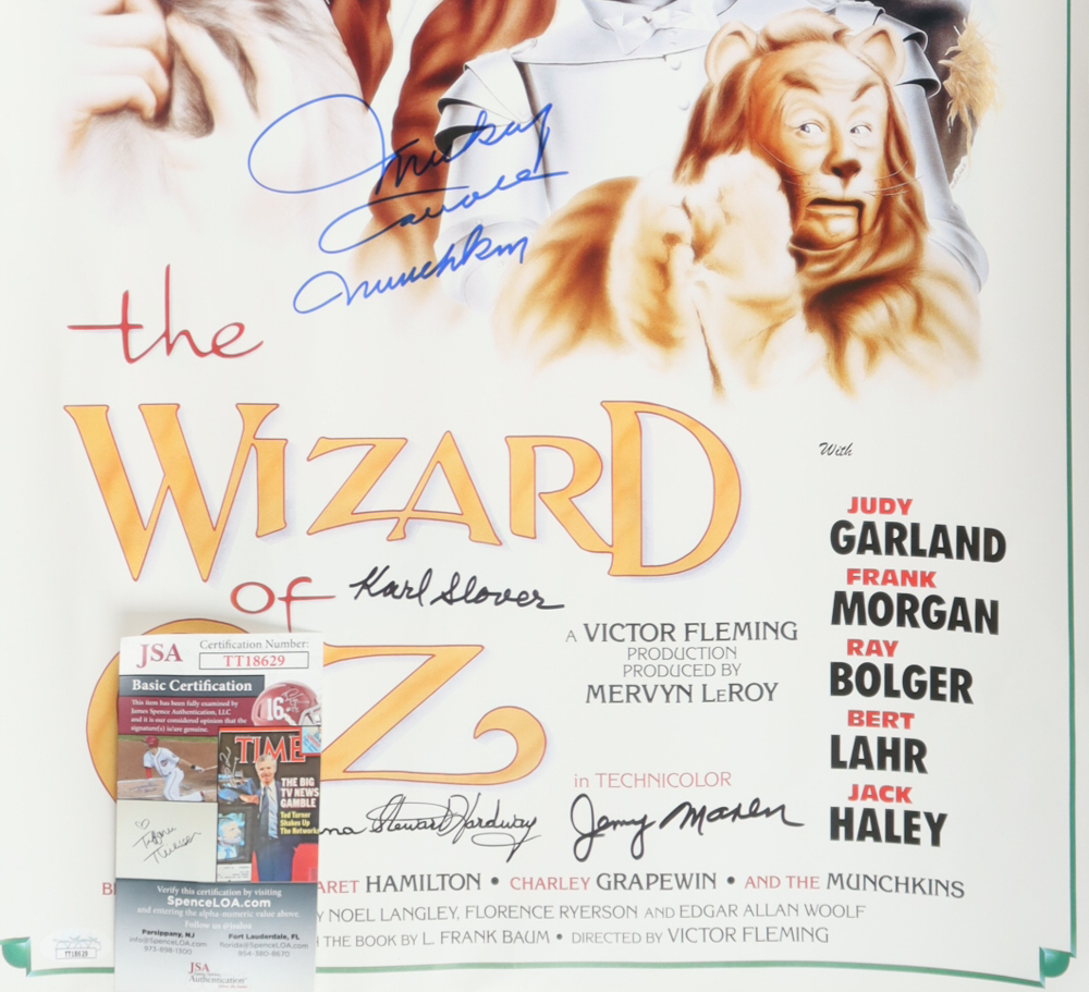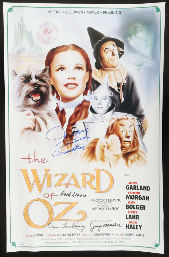 Poster measures approximately 16" x 24" in size and has been hand-signed and inscribed by Mickey Carroll (D. 2009), Jerry Maren (D. 2018), Karl Slover (D. 2011), and Donna Stewart Hardway (D. 2008). Please note, there are creases throughout the poster.