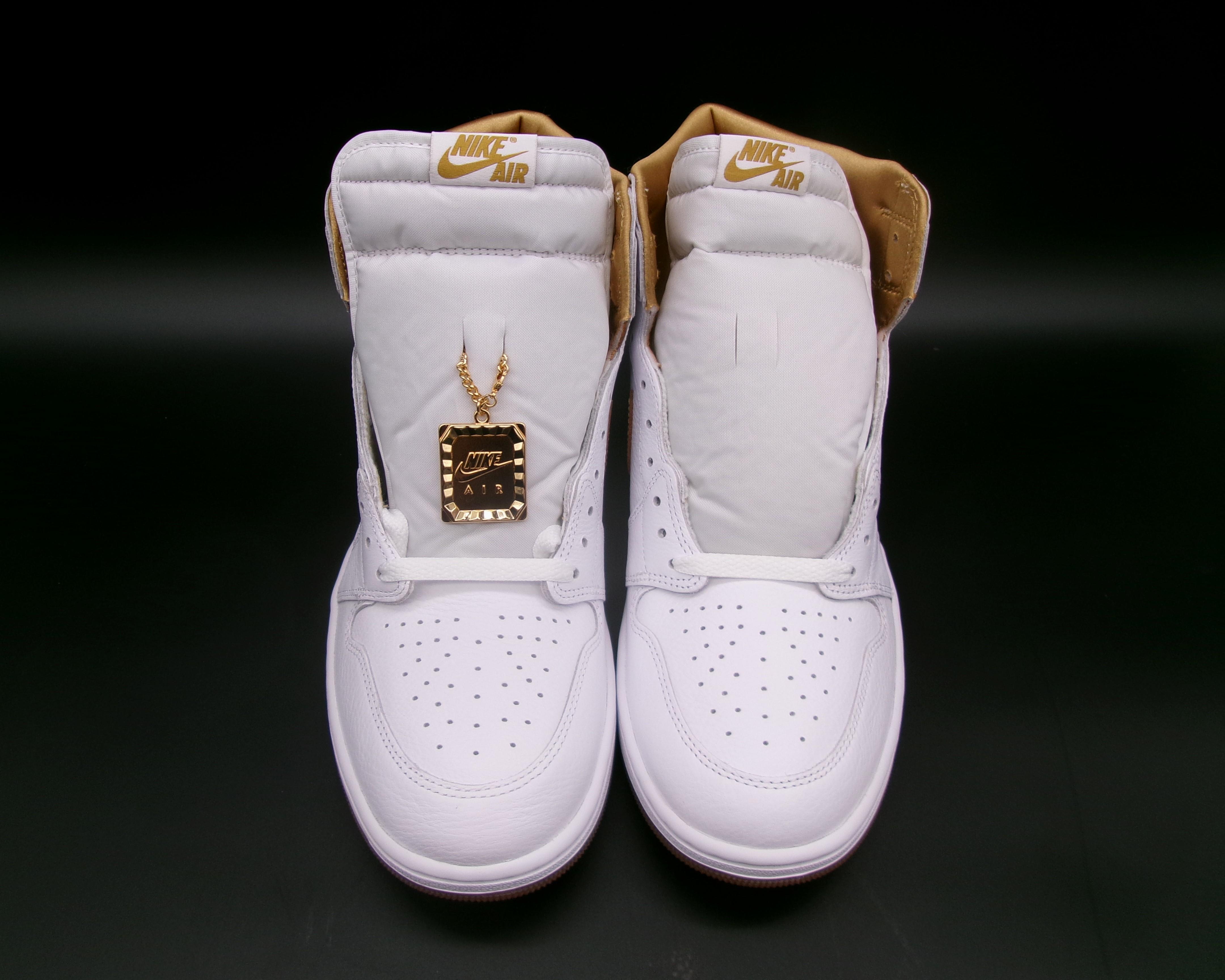 Jordan's iconic Air Jordan 1 Retro High OG sneakers are a gilded take on MJ's first signature model. They're crafted from pristine white leather with glossy gold accents and a detachable logo charm at the laces of the right foot.