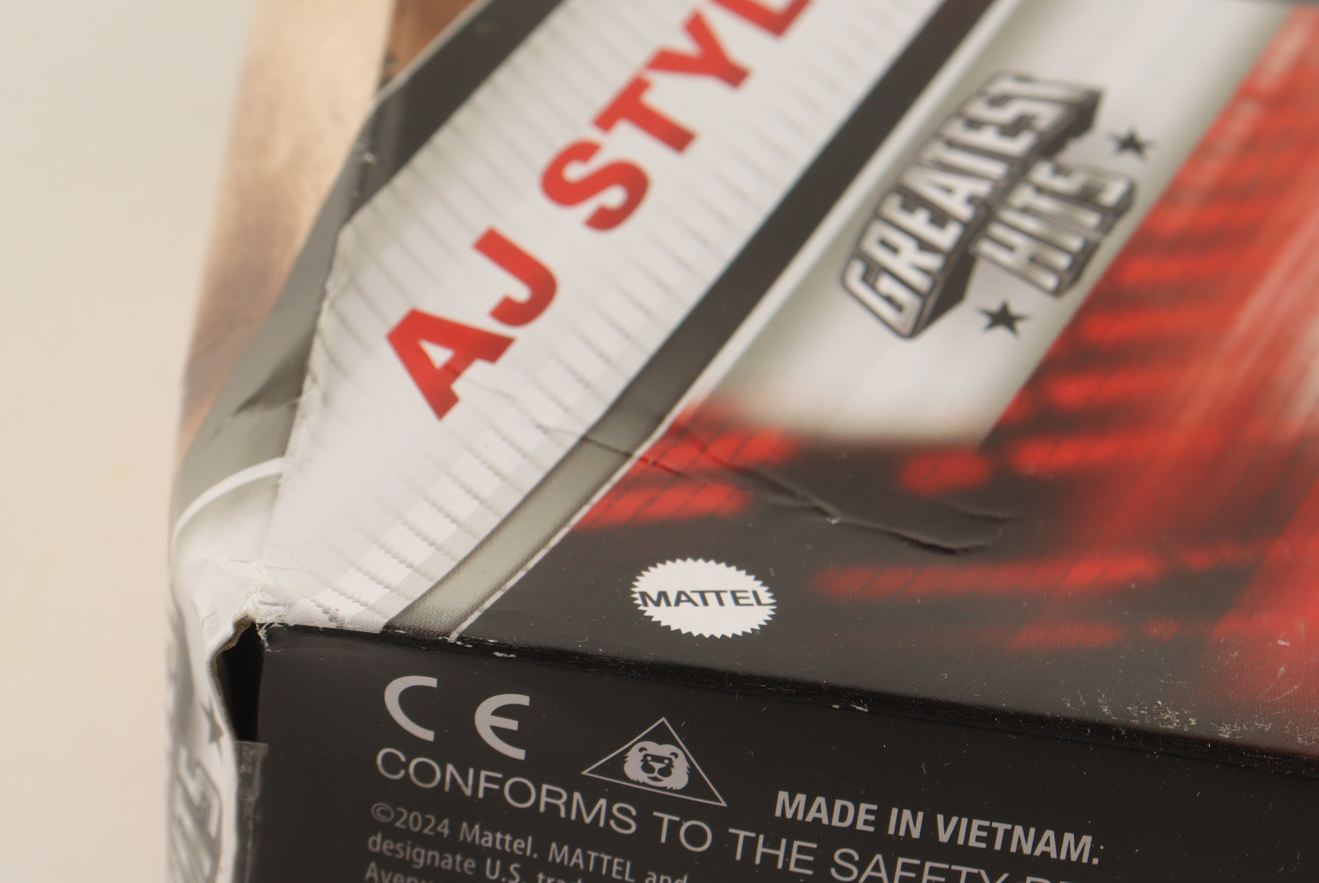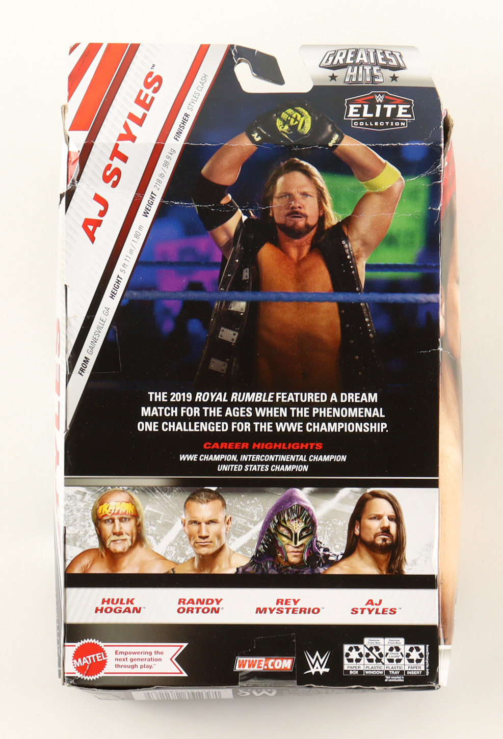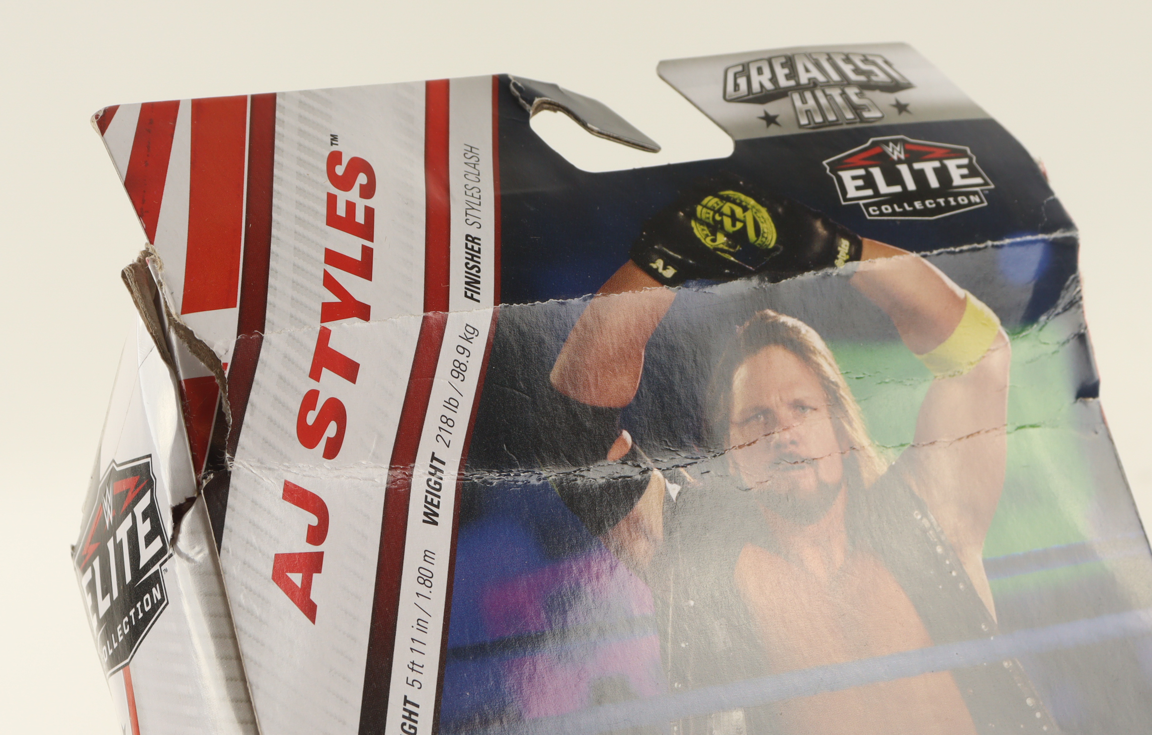 2023 Mattel Elite Collection action figure measures approximately 6" tall and has been hand-signed on the packaging by AJ Styles. Please note, there is crushing and tearing on the packaging - see photos for more detail regarding the condition of the item.