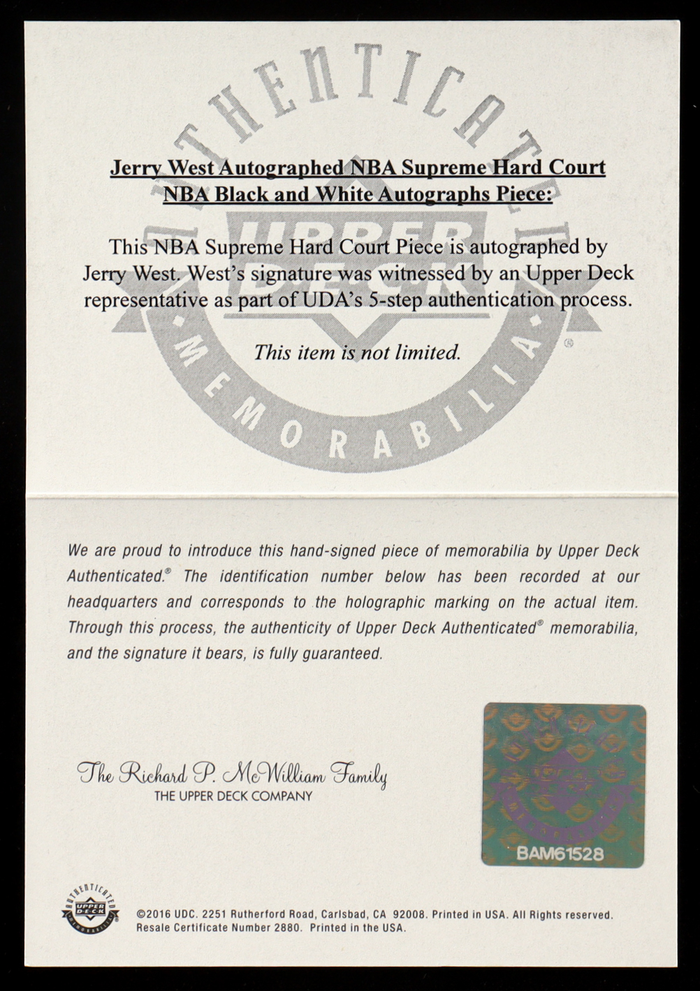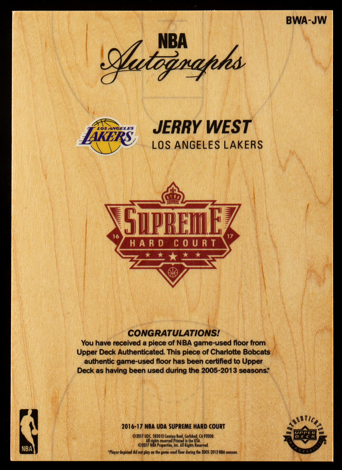 Jerry West 2016-17 Upper Deck Supreme Hard Court NBA Autographs #BWAJW (UDA)