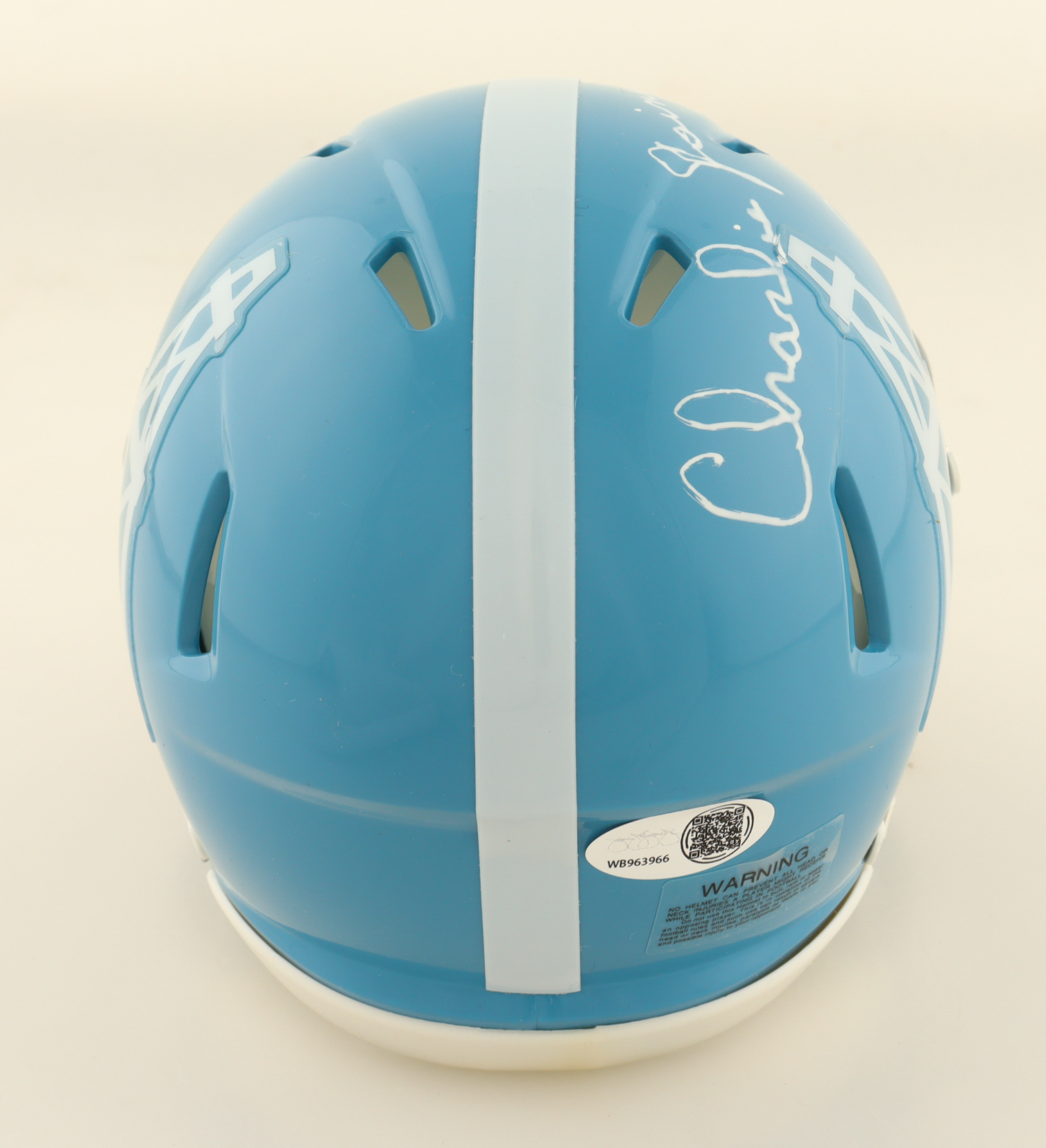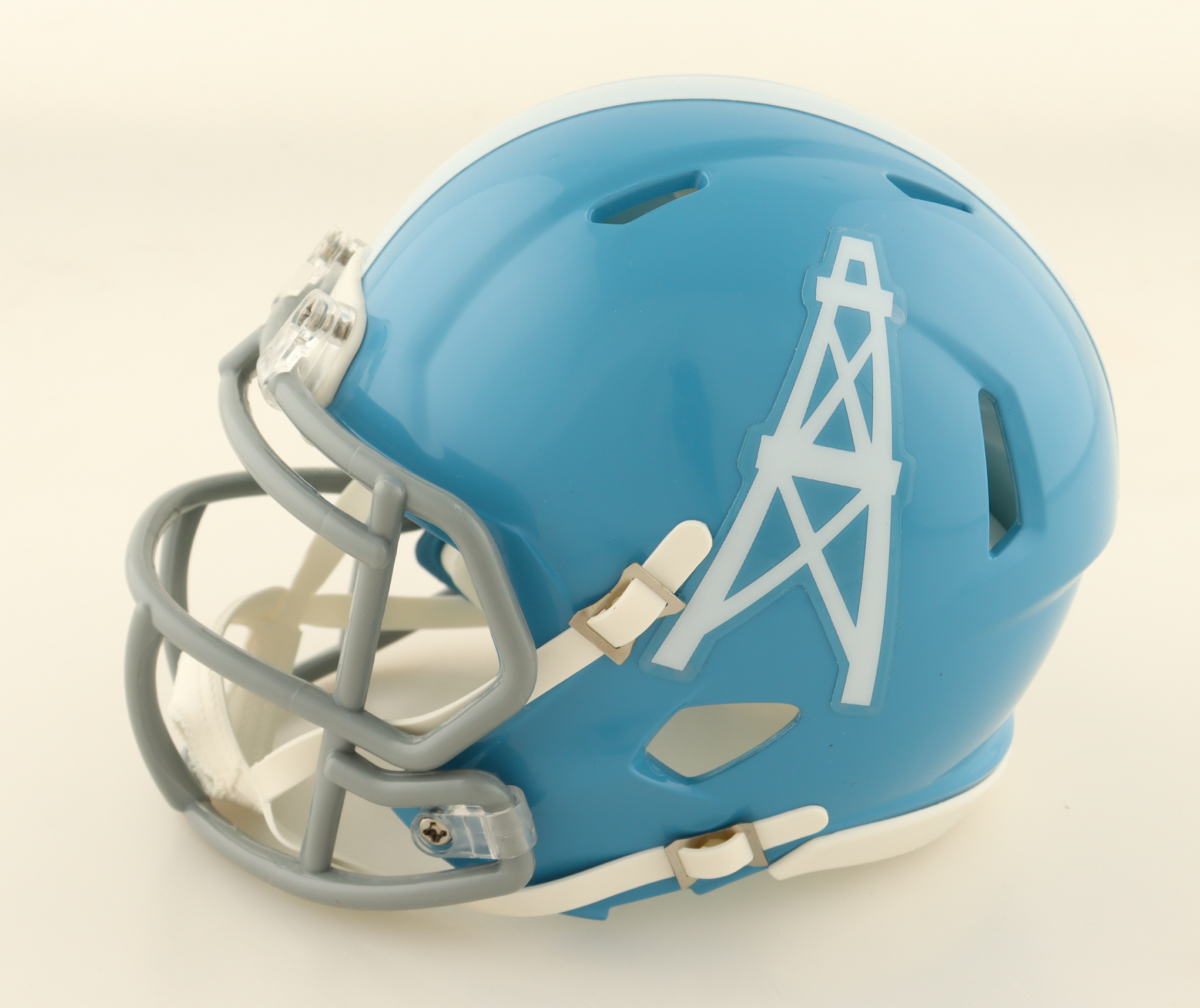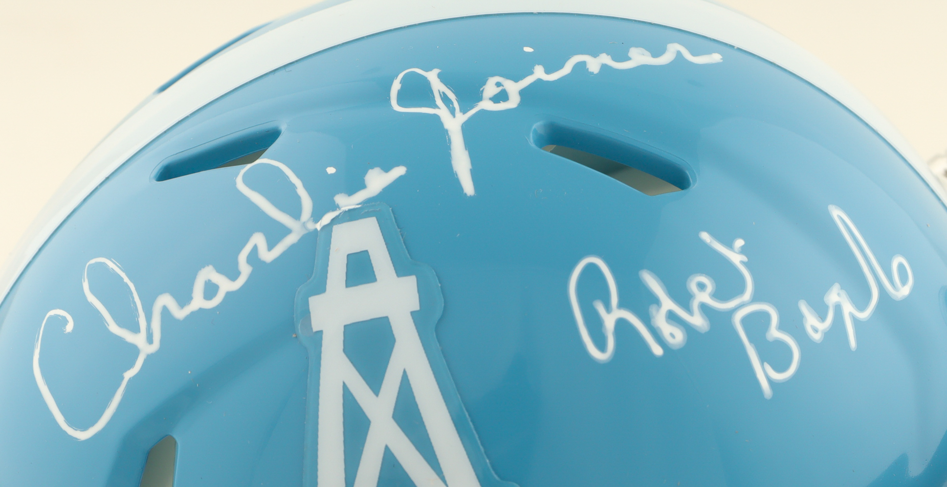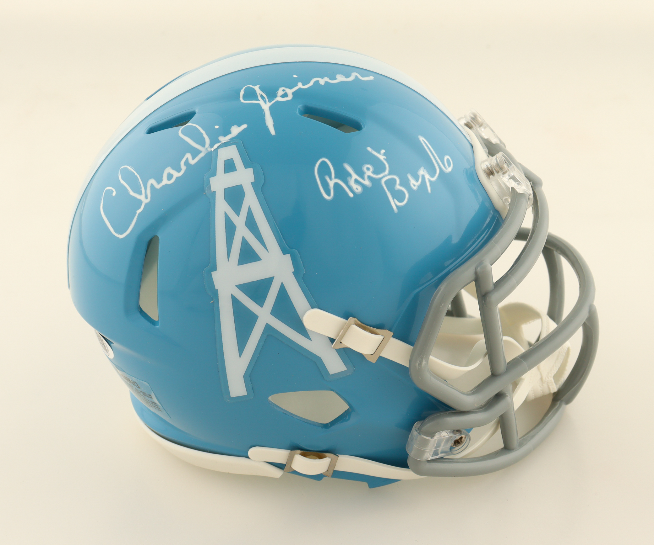 Riddell Houston Oilers Throwback Speed mini helmet. Hand-signed by Robert Brazile (HOF) and Charlie Joiner (HOF). Please note that the signatures are smeared.