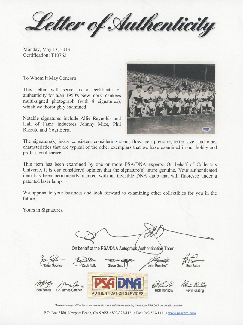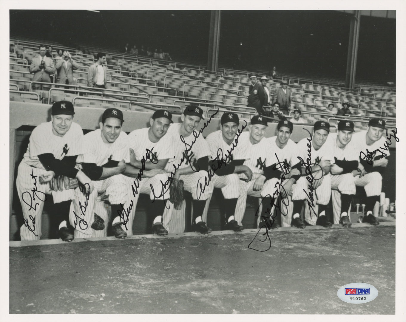 Photo measures 8" x 10" in size and has been hand signed in black felt-tip pen by Yogi Berra, Allie Reynolds, Phil Rizzuto, Johnny Mize, Ed Lopat, Charlie Silvera, Hank Bauer and Gene Woodling.