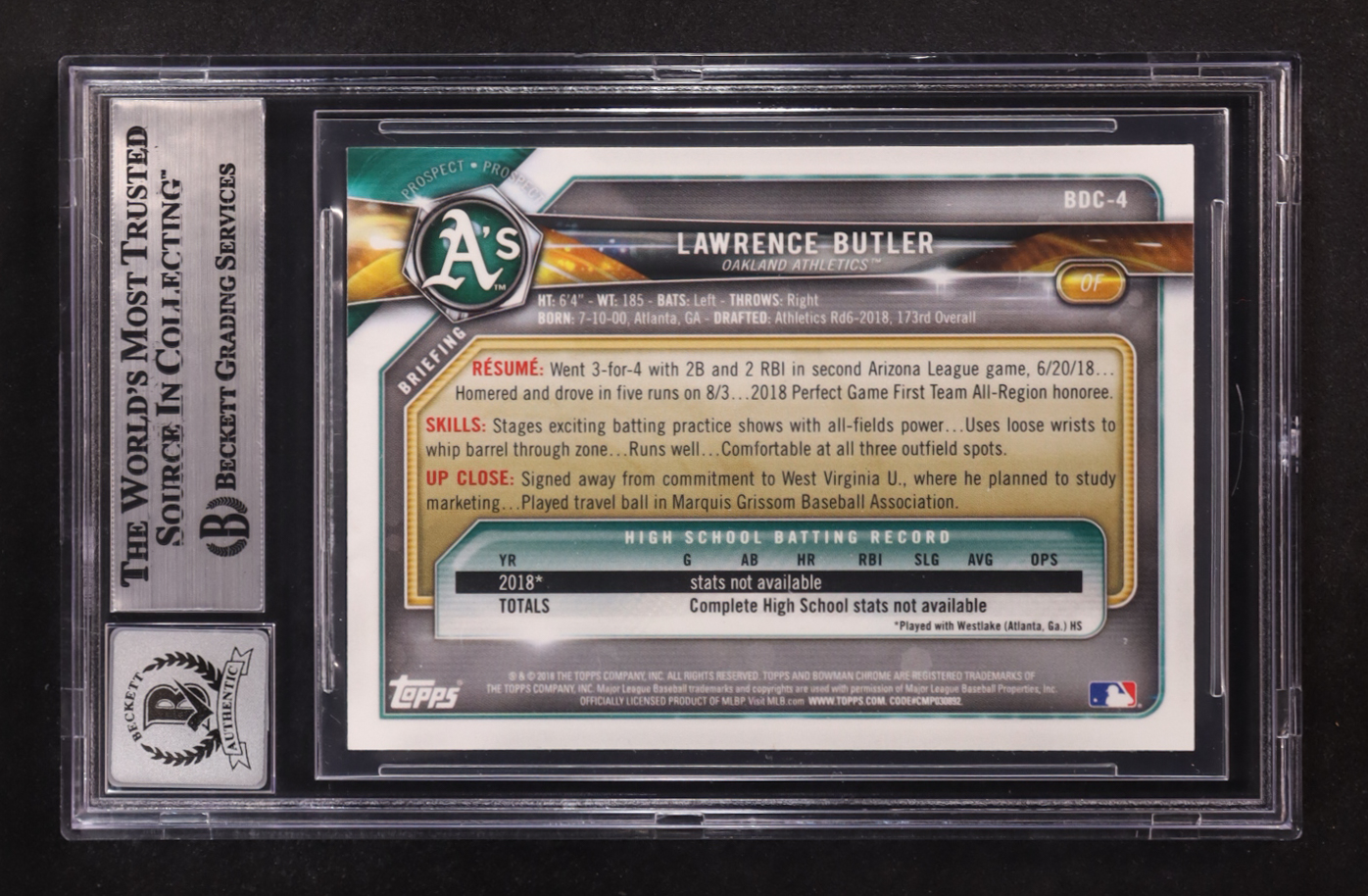 Lawrence Butler Signed 2018 Bowman Chrome Draft #BDC-4 RC (BGS | Autograph Graded BGS 10)