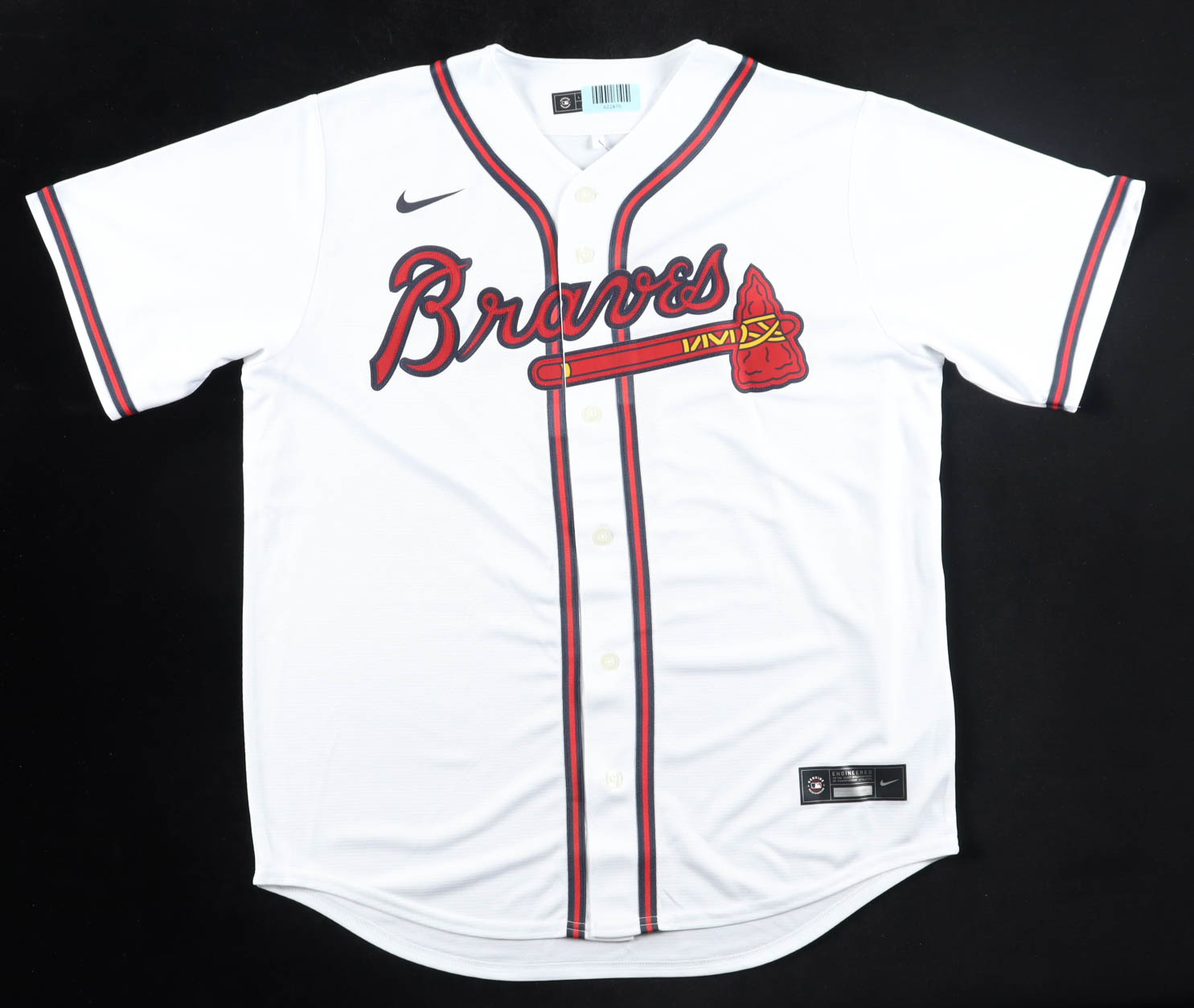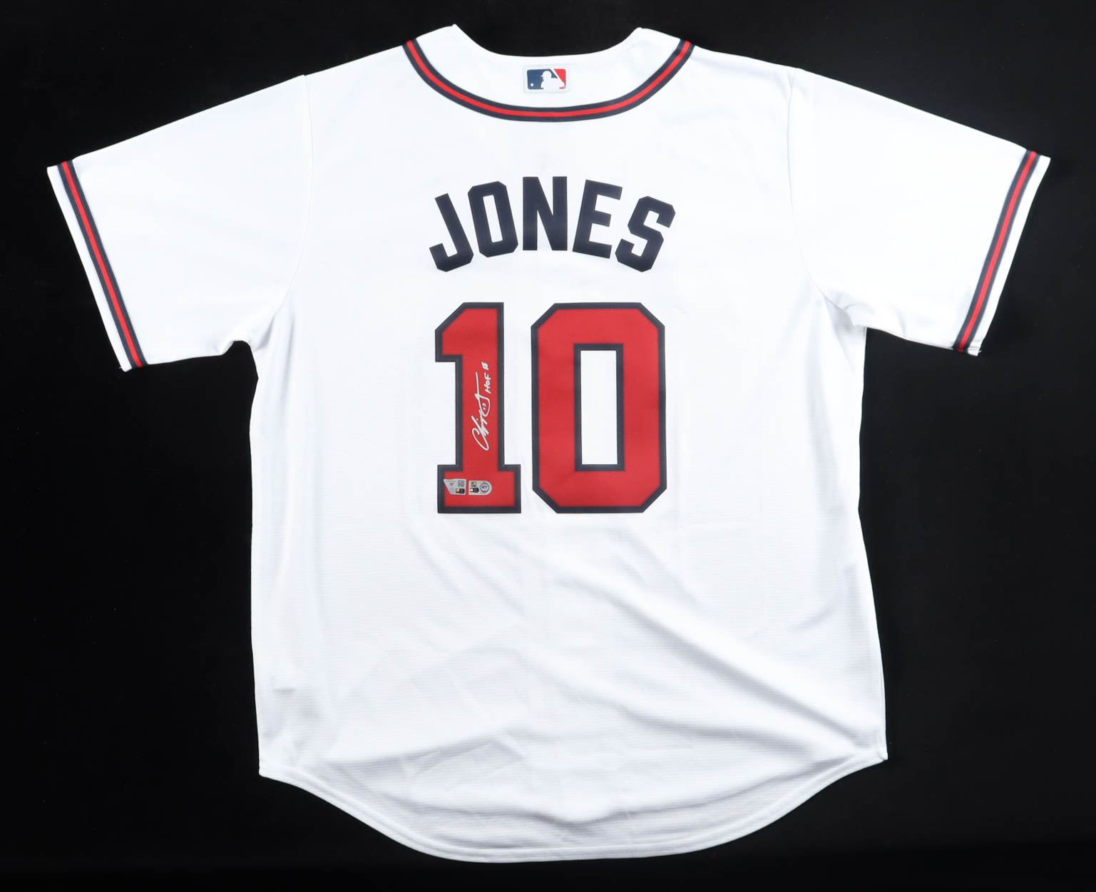 Nike authentic jersey with everything pressed on, size L. Hand-signed and inscribed by Chipper Jones (Atlanta Braves, HOF).