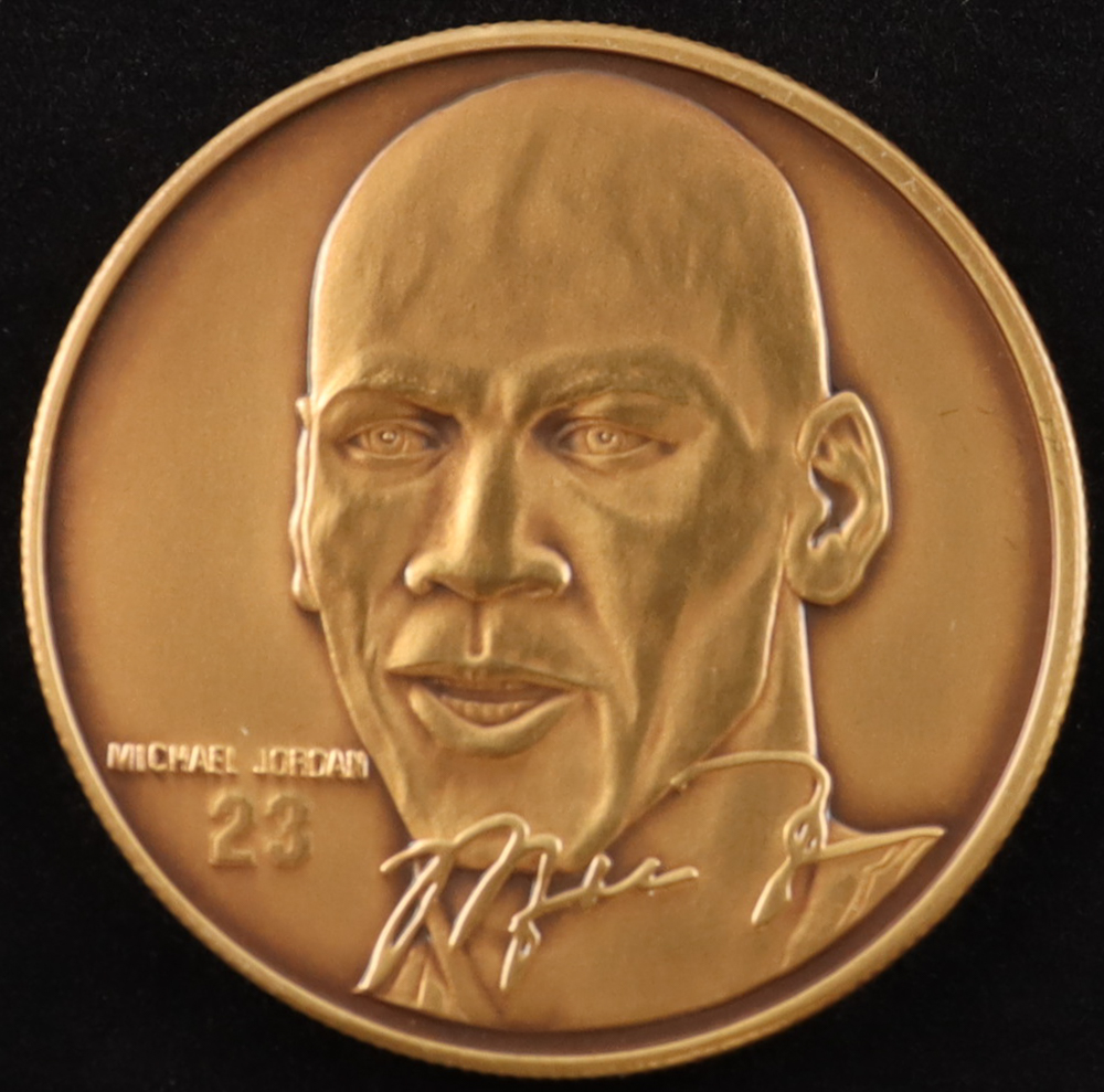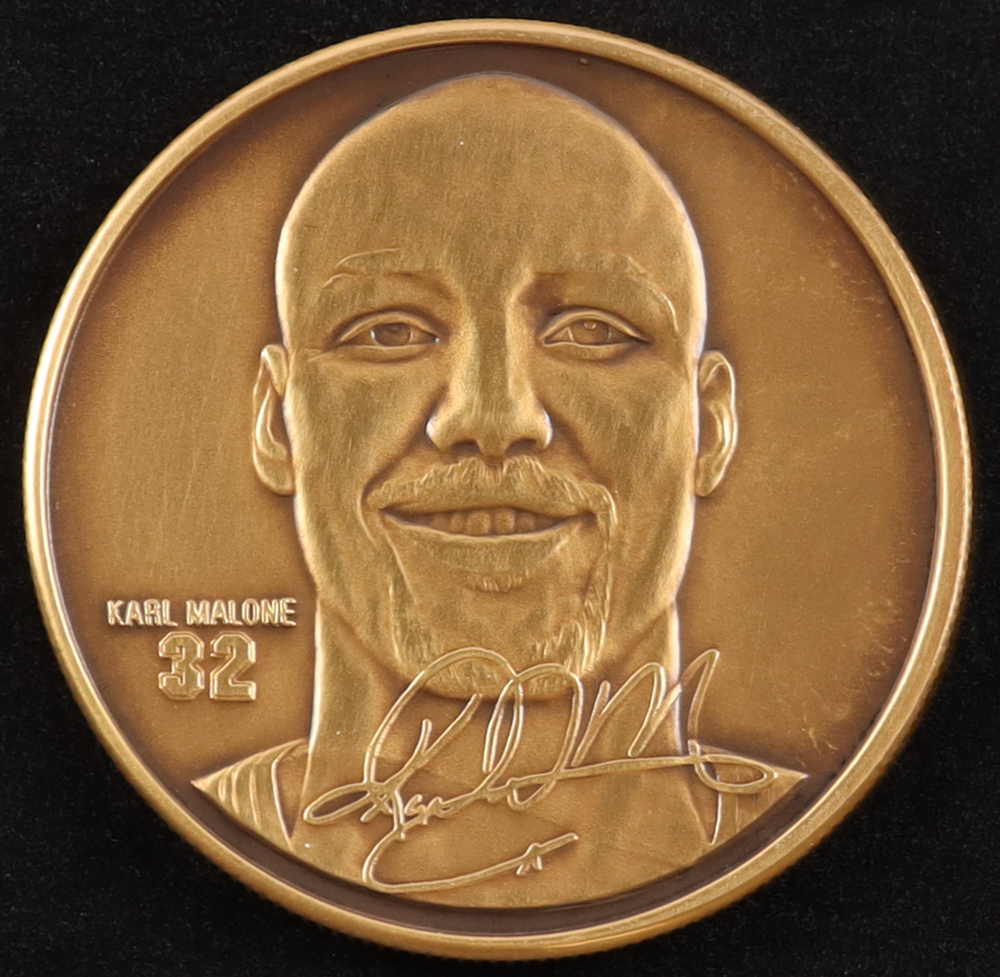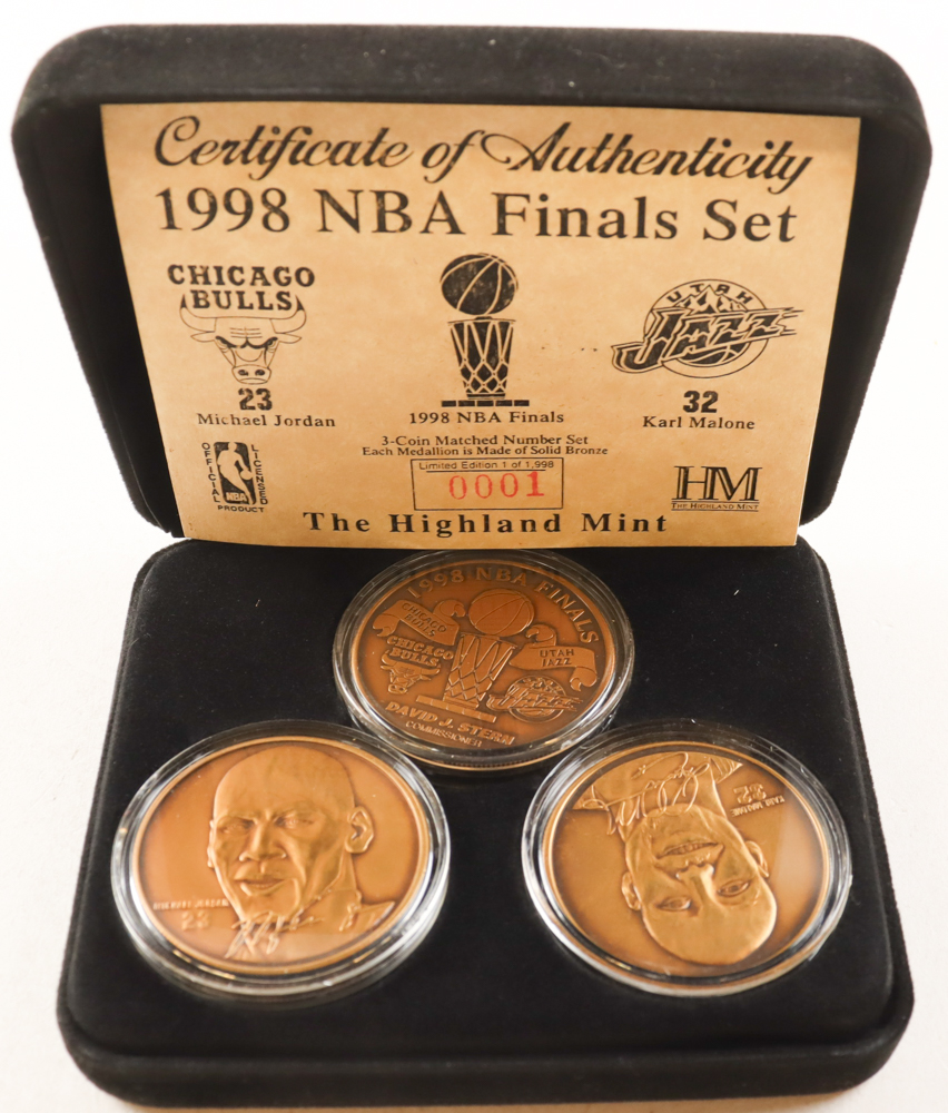 The Highland Mint Matched Number Solid Bronze (3) medallion Set features Michael Jordan (Chicago Bulls) and Karl Malone (Utah Jazz). The coin set is limited edition, numbered #0001/1,998.