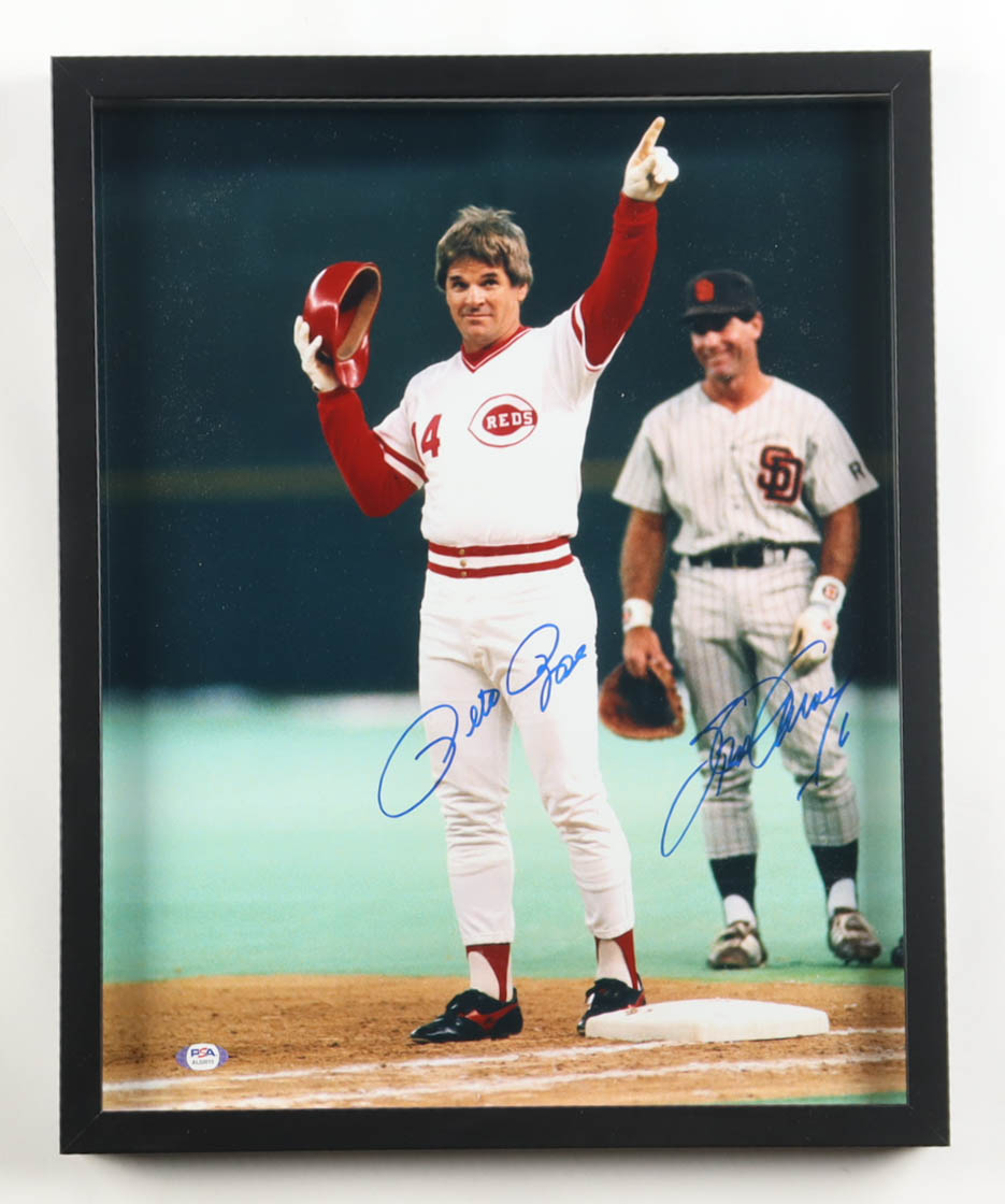 Custom frame measures 16.5" x 21" in size and has been hand-signed by Pete Rose (D. 2024, Cincinnati Reds) and Steve Garvey (San Diego Padres).