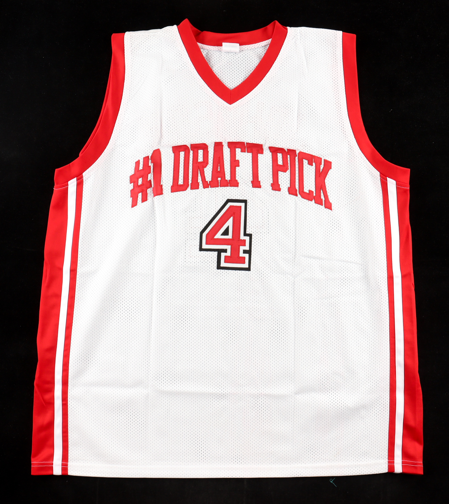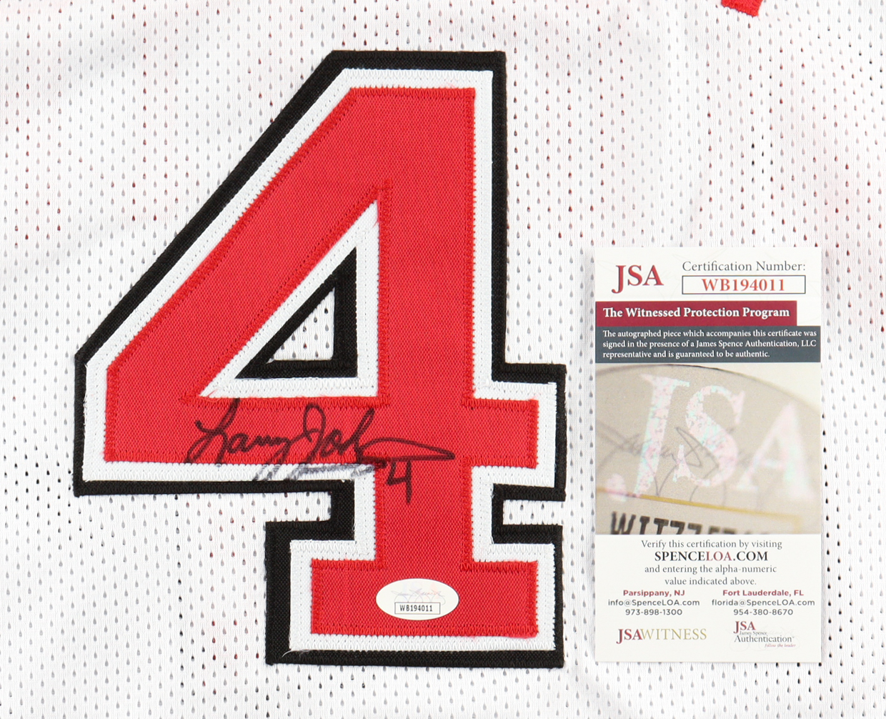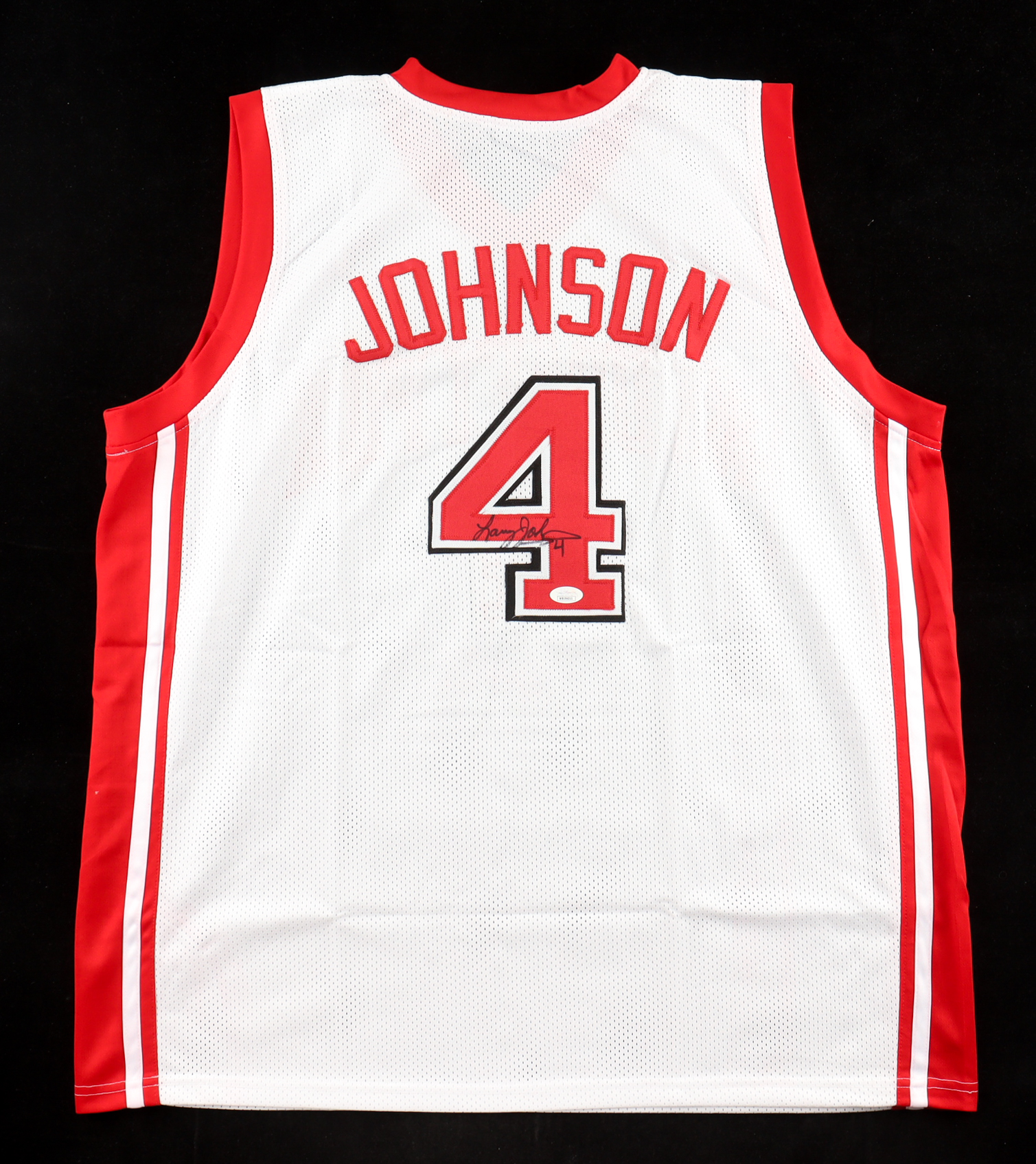 Custom jersey with everything sewn on, size XL. Hand-signed by Larry Johnson.