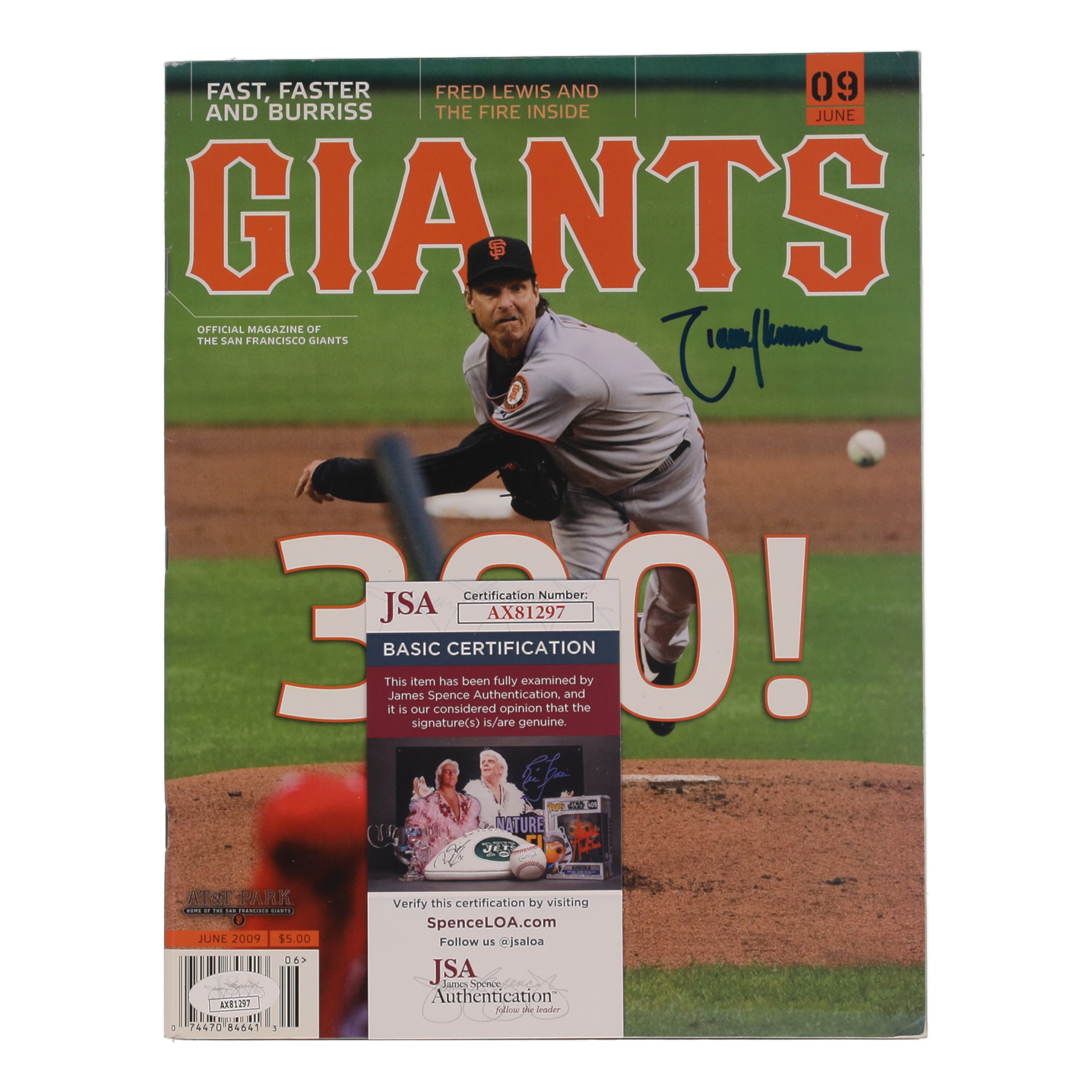 June 2009 Issue of Giants Magazine has been hand-signed on the front cover by Randy Johnson (San Francisco Giants, HOF).