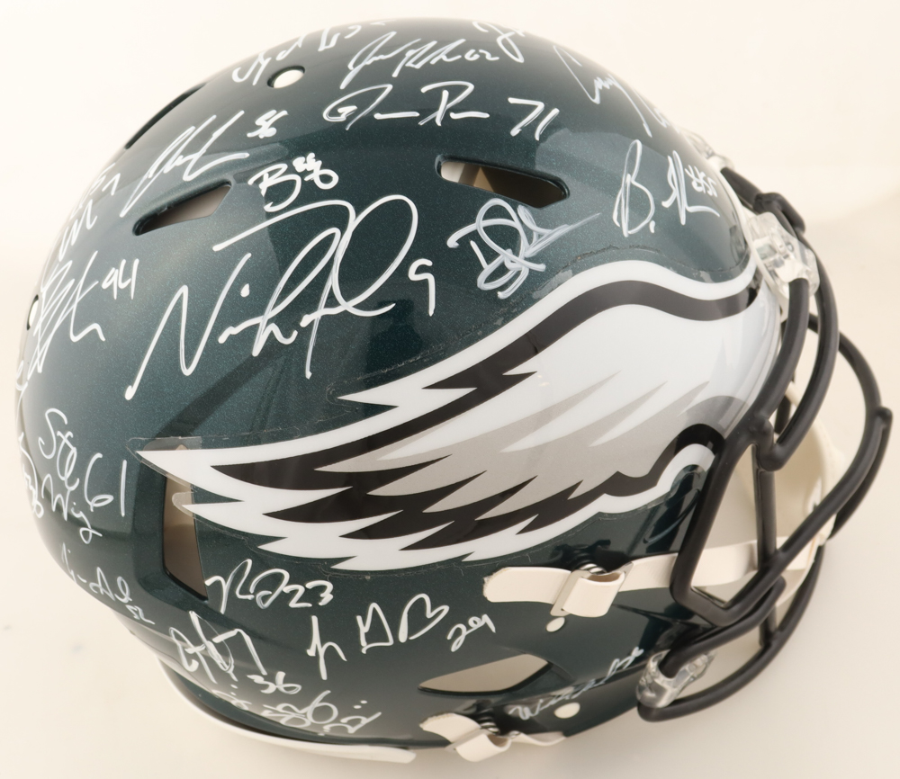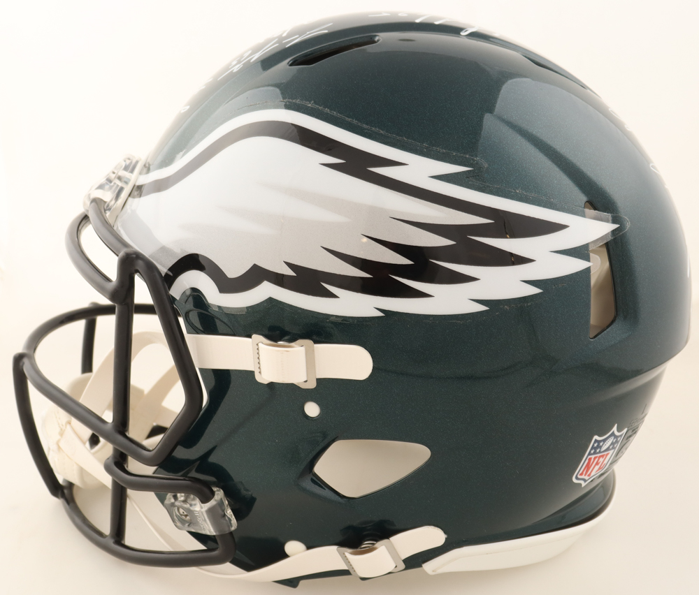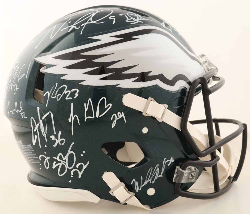 Riddell Philadelphia Eagles full-size speed helmet. Hand-signed and inscribed by Legarrette Blount, Nick Foles, Kenjon Barner, Brent Celek, Duce Staley, Stefen Wisniewski, Beau Allen, Mychal Kendricks, Chris Long, Najee Goode, Doug Pederson, Jason Peters, Dannell Ellerbe, Brandon Graham, Wendell Smallwood, Trey Burton, Corey Clement, Jason Kelce, Darren Sproles, Jay Ajayi, Lane Johnson, and Rodney Mcleod.