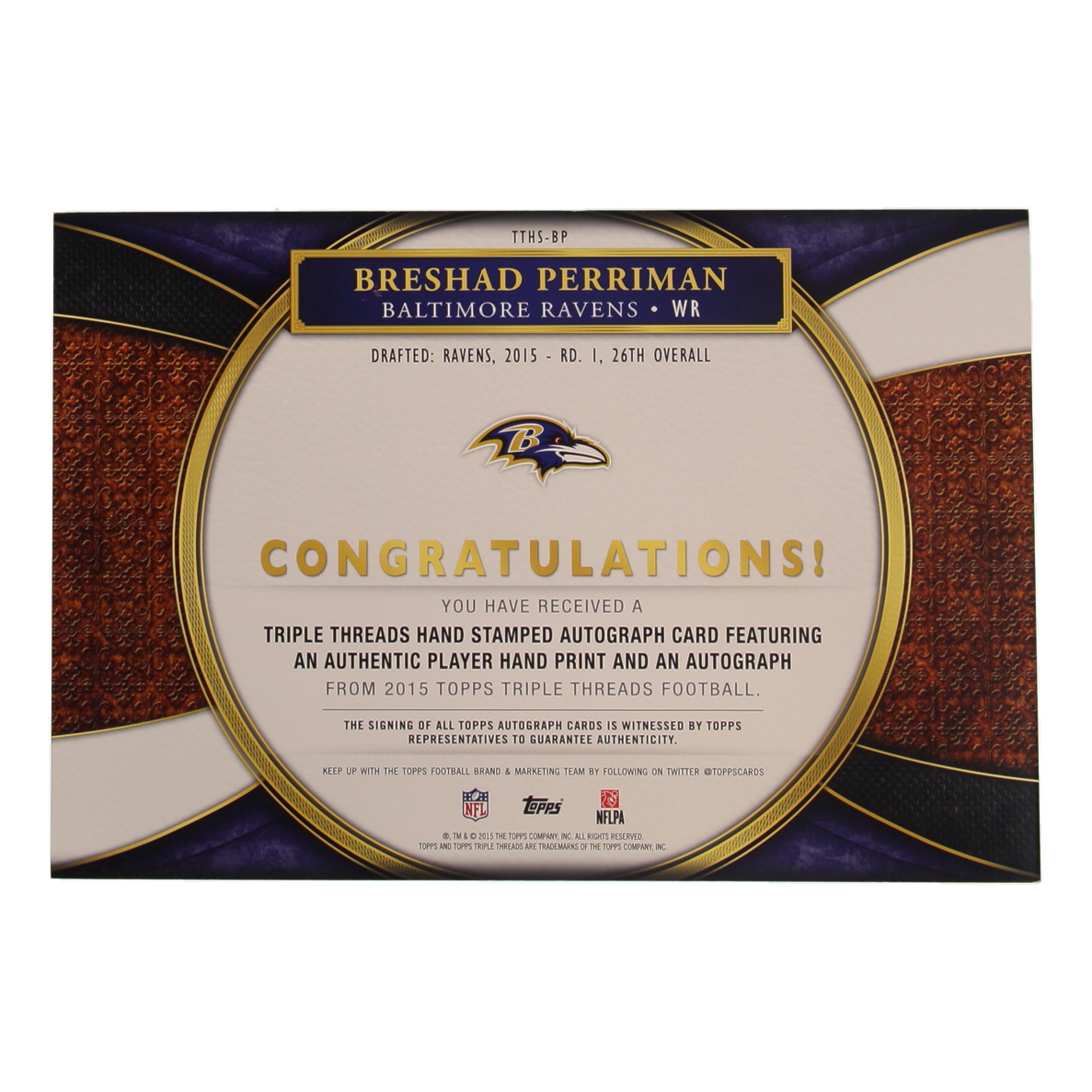 Breshad Perriman LE 2015 Topps Triple Threads Jumbo Card with Handprint Autographs #TTHS-BP