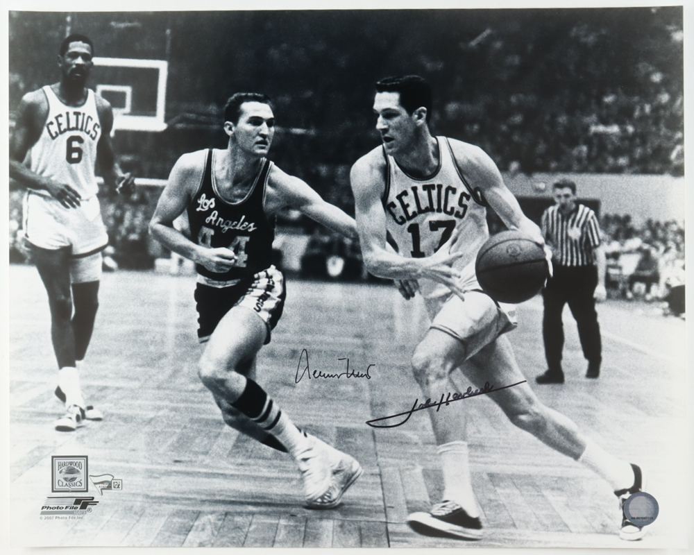 Photo measures 16" x 20" in size and has been hand-signed by Jerry West (D. 2024, Los Angeles Lakers, HOF) and John Havlicek (D. 2019, Boston Celtics, HOF). Please note, there are creases throughout the photo.