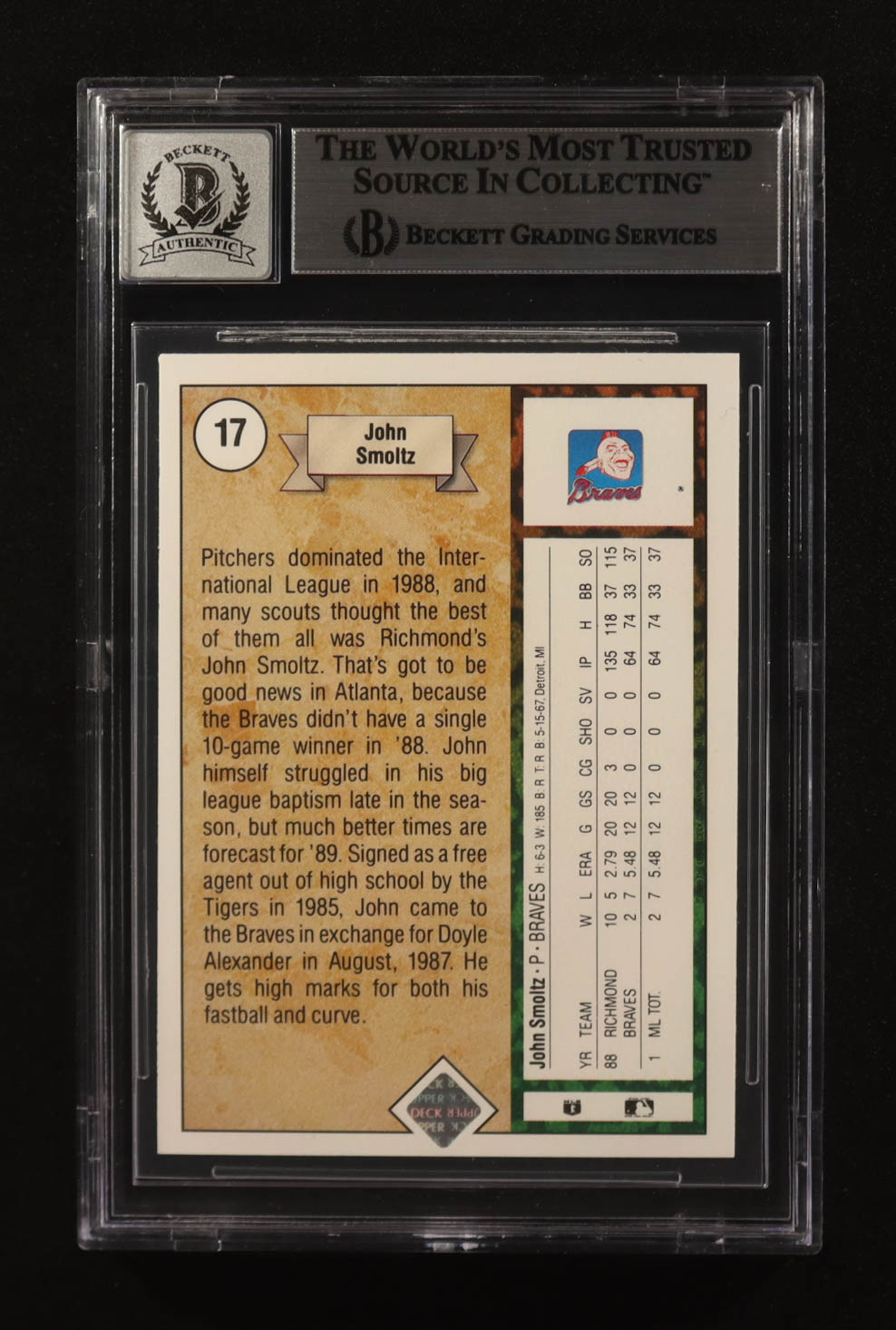 John Smoltz Signed 1989 Upper Deck #17 RC (BGS | Autograph Graded BGS 10)