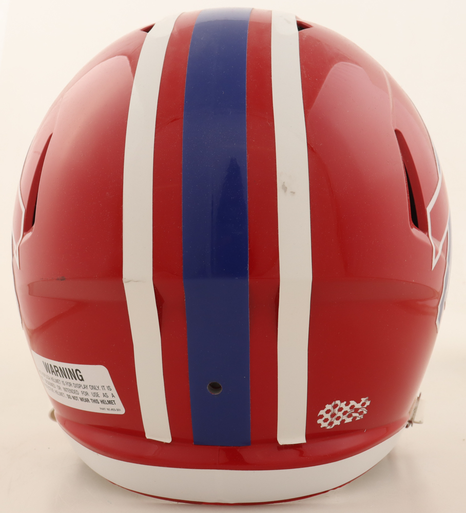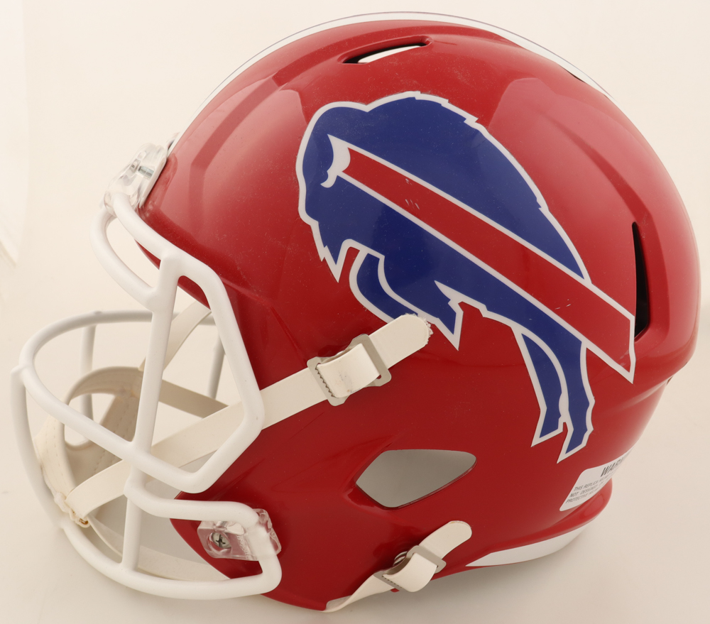 Riddell Buffalo Bills full-size replica throwback speed helmet. Please note, the helmet is unsigned and there is a torn off hologram on the back of the helmet.