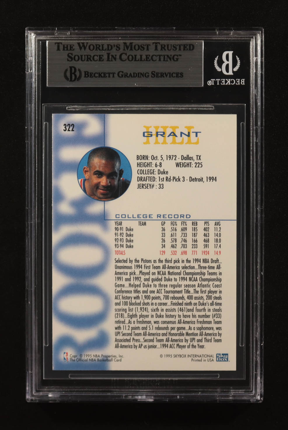 Grant Hill Signed 1994-95 NBA Hoops Skybox #322 RC (BGS)