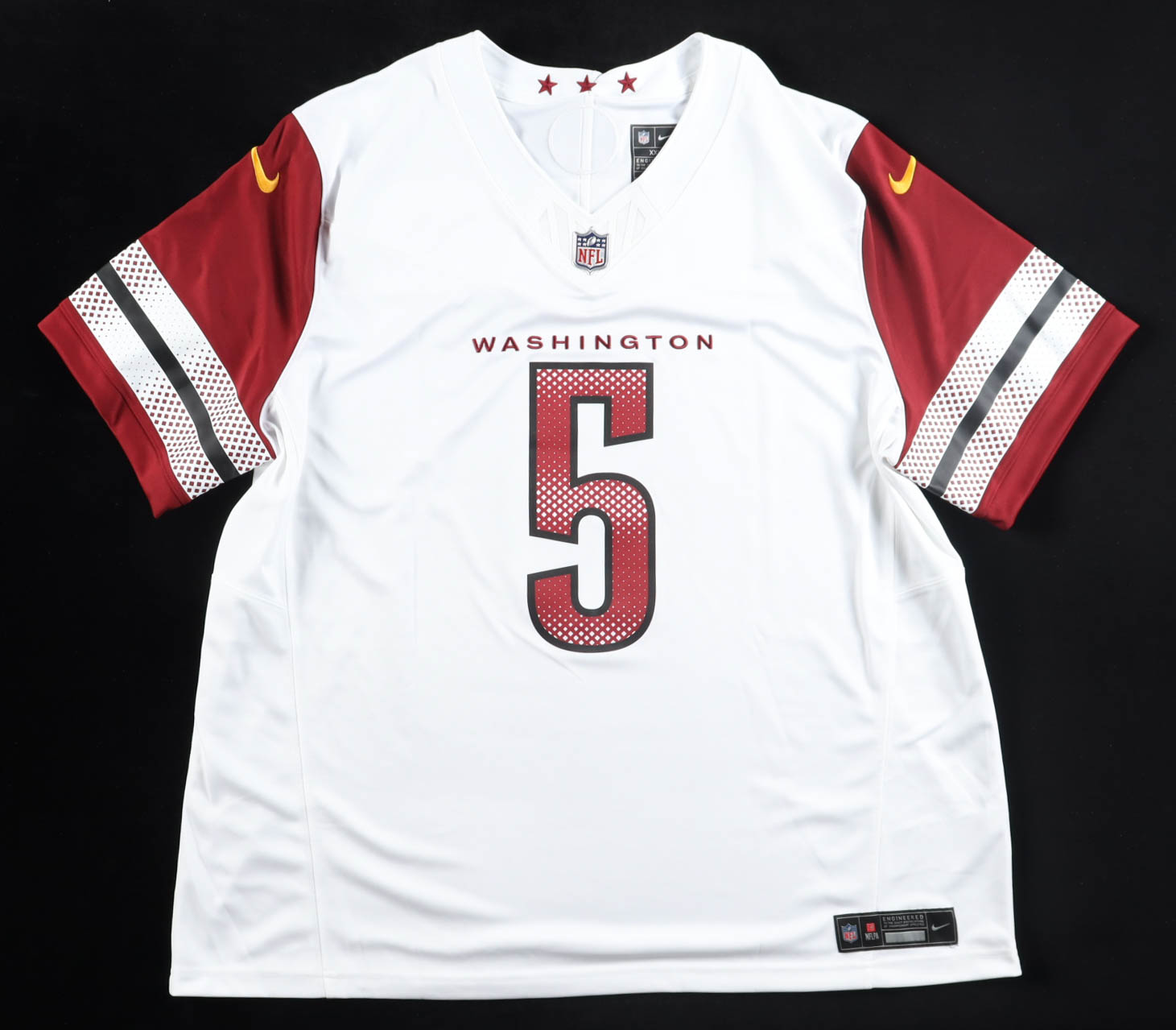 Nike jersey with everything pressed on, size XXL. Hand-signed and inscribed by Jayden Daniels (Washington Commanders). Please note, there is a stain above the reverse number.