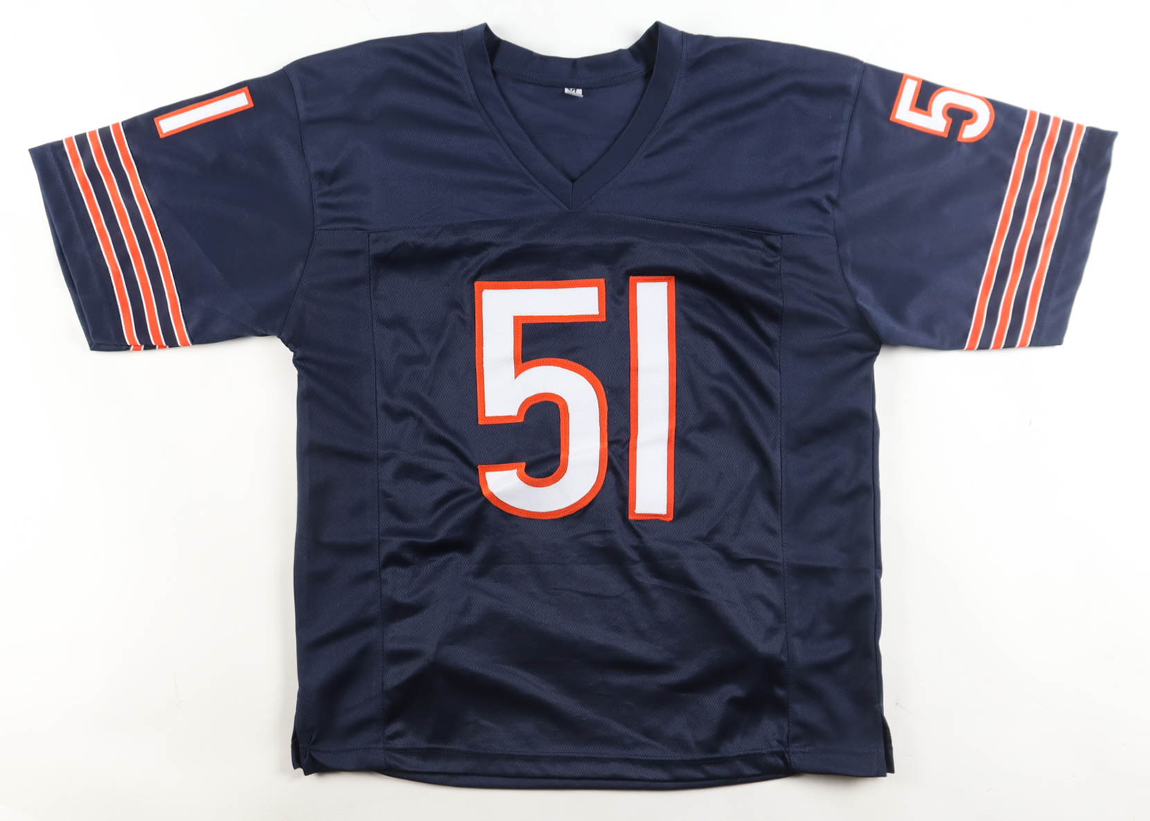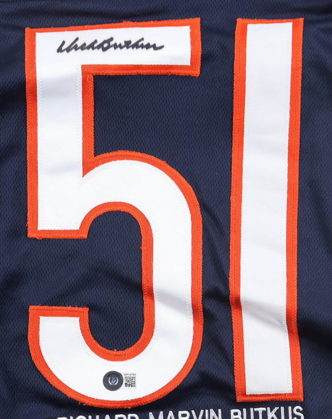 Custom jersey with everything sewn on, size XL. Hand-signed and inscribed by Dick Butkus (Chicago Bears, HOF). Butkus's career highlights have been custom-stitched below the reverse numbers.