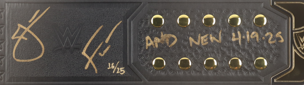 Replica championship belt measures approximately 50" long. Hand-signed and inscribed by Jacob Fatu. Limited edition hand-numbered #16/25.