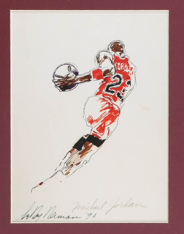 Custom frame measures 12" x 16" in size and features an art print that has been hand-signed by Leroy Neiman (D. 2016). Please note Jordan signature is a facsimile. Please see photos for details regarding the item.