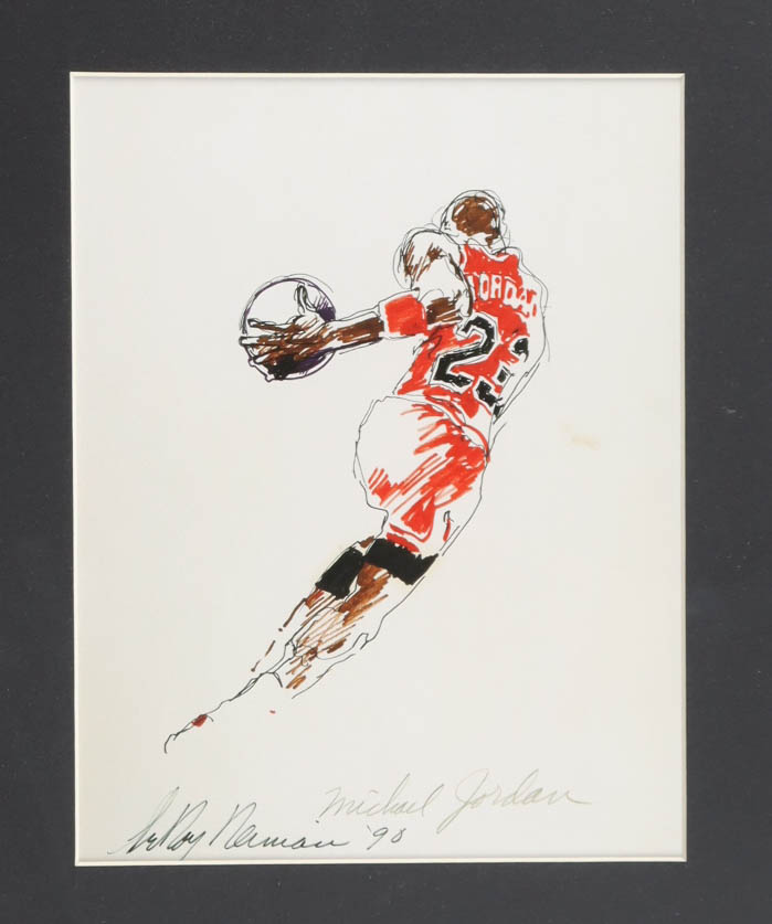 Custom frame measures 13" x 16" in size and features an art print that has been hand-signed by Leroy Neiman (D. 2016). Please note Jordan signature is a facsimile. Please see photos for details regarding the item.