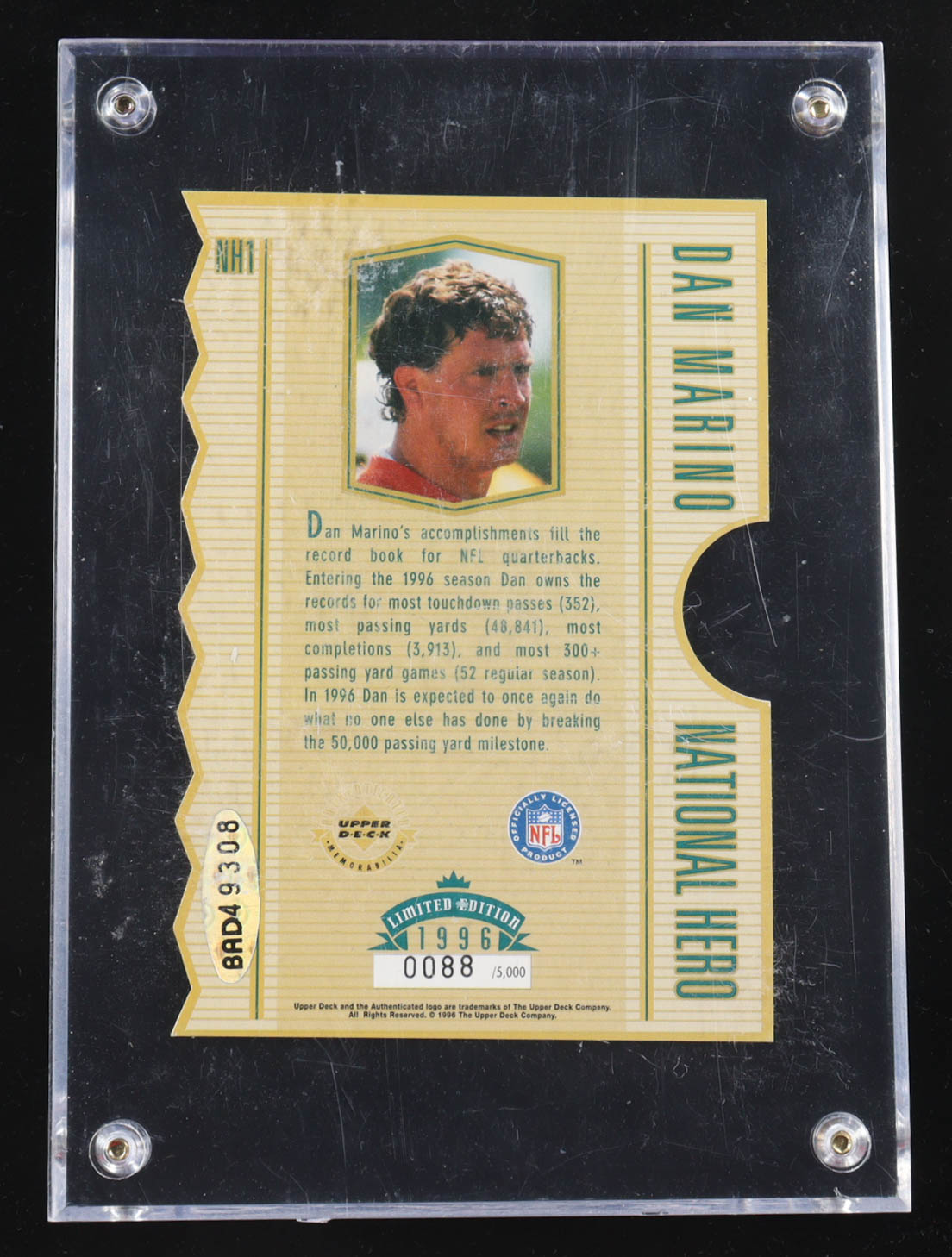 Dan Marino Signed 1996 Upper Deck National Hero #NH1 #88/250 with Acrylic Encapsulation (UDA)
