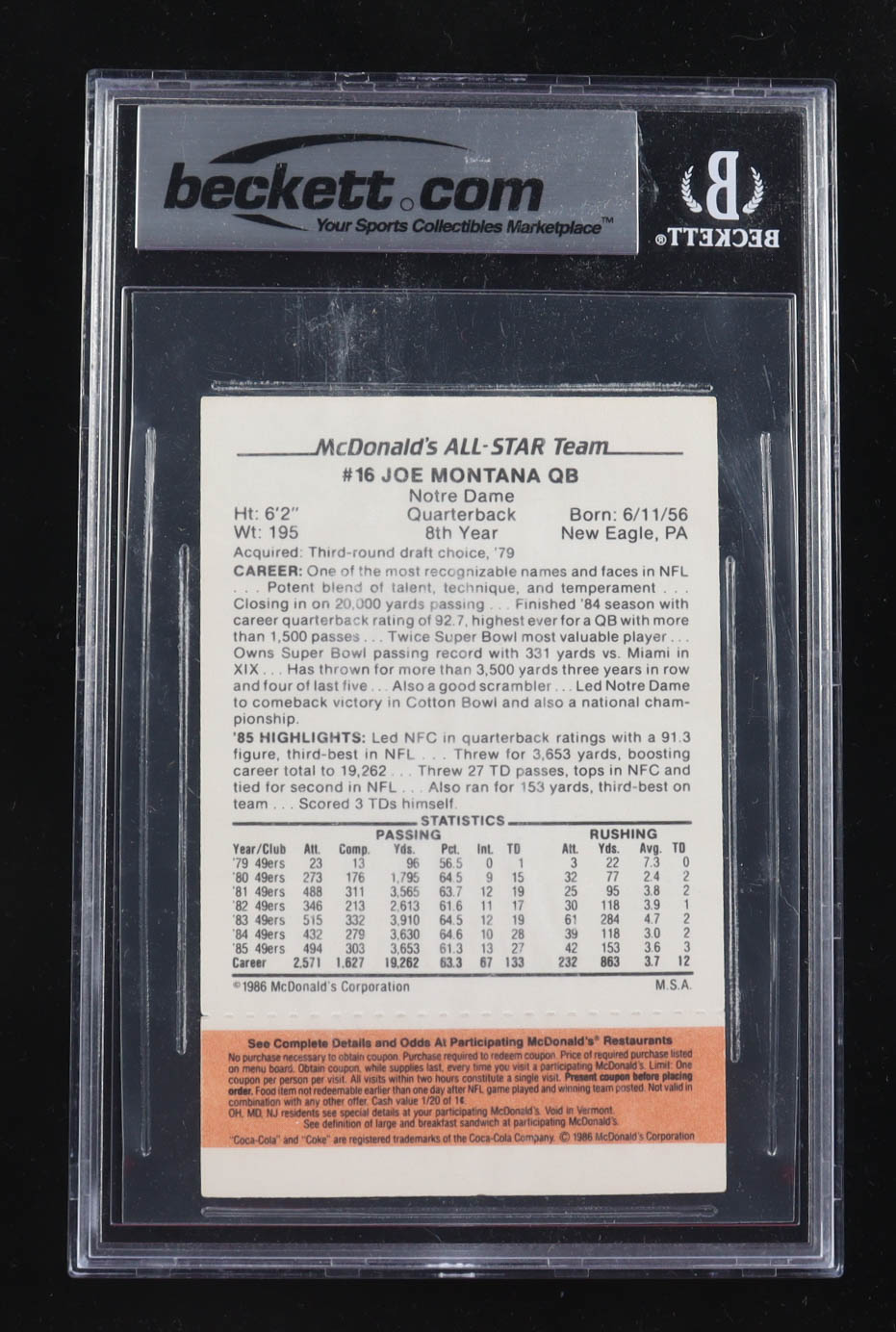 Joe Montana Signed 1986 McDonald's All-Stars #16 (BAS | Autograph Grade 10)