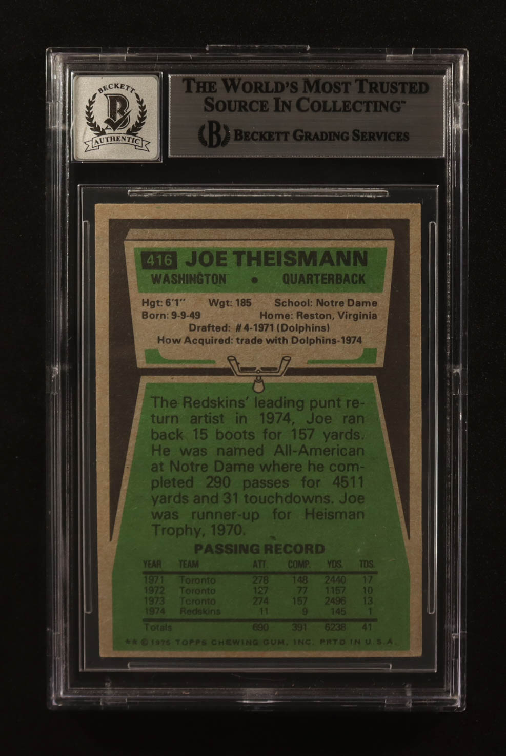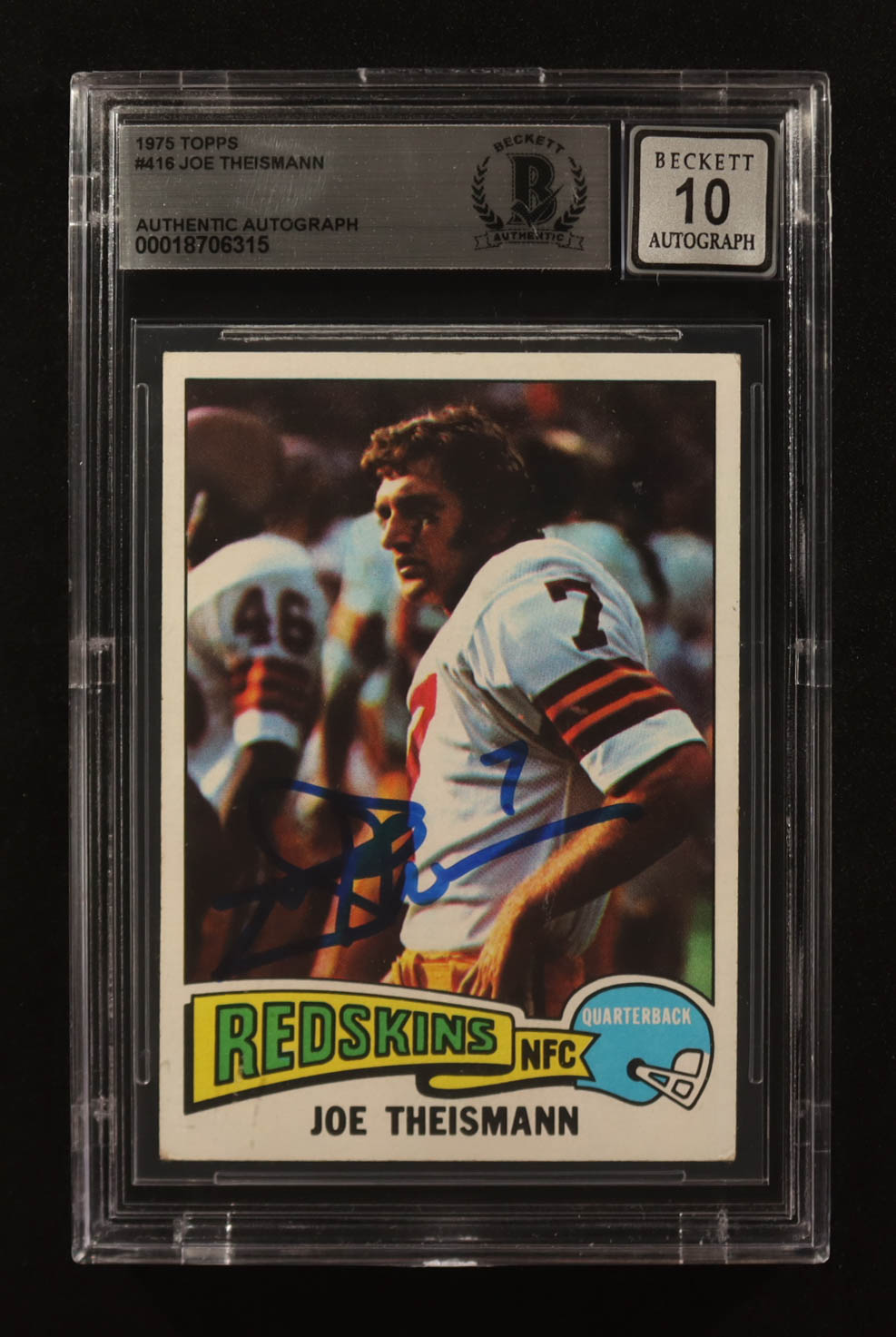 Joe Theismann Signed 1975 Topps #416 RC (BGS | Autograph Graded BGS 10)