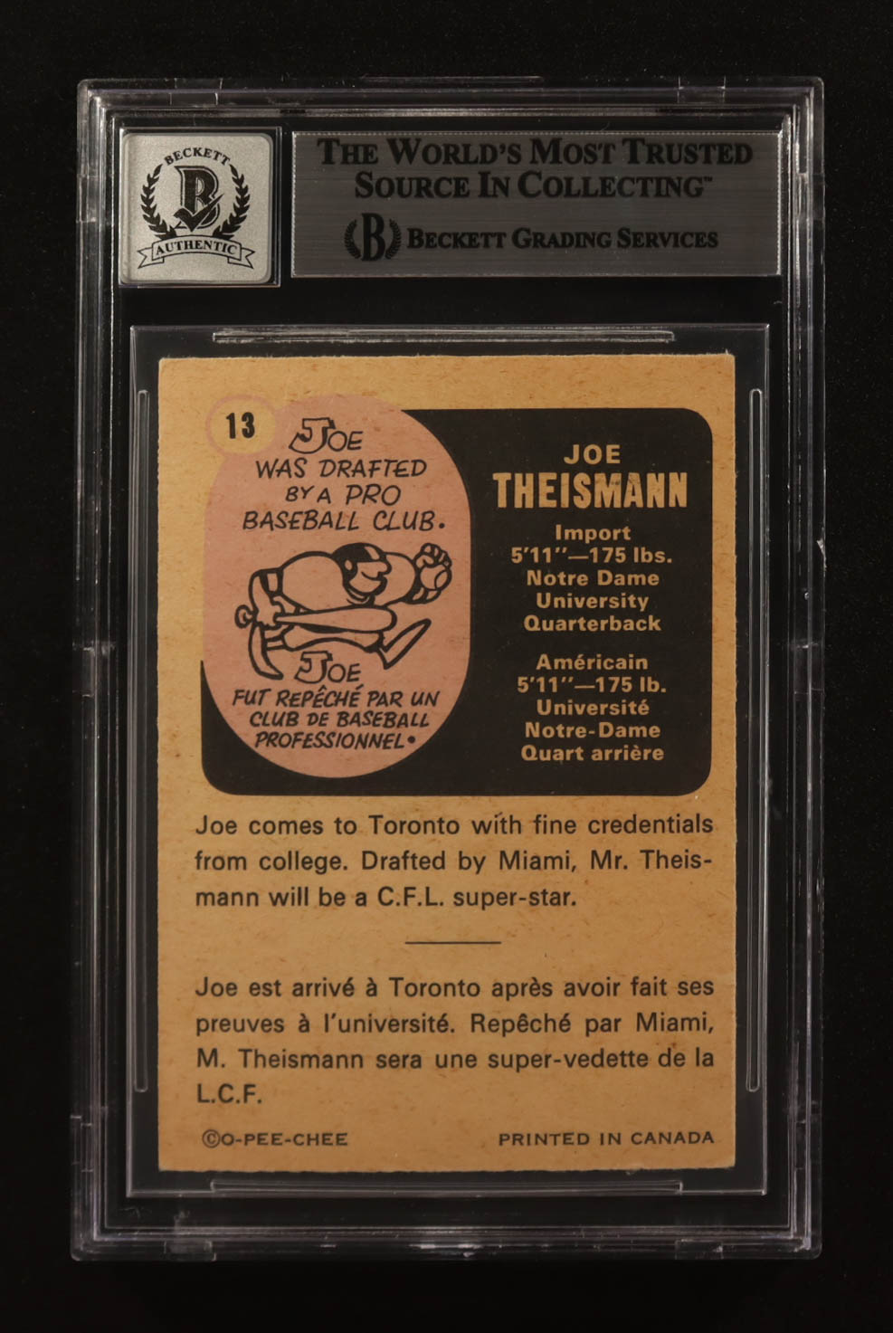Joe Theismann Signed 1971 O-Pee-Chee CFL #13 RC (BGS | Autograph Graded BGS 10)