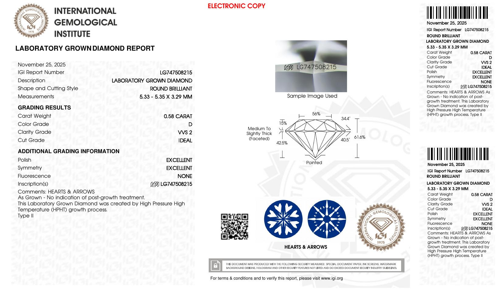 .58 Carats Lab Grown Diamond Loose D, VVS2 | (IGI Cert) | Hearts & Arrowz Cut
