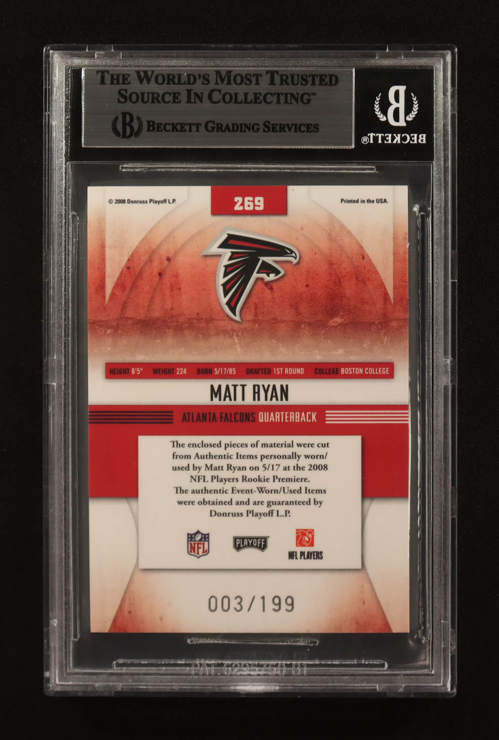 Matt Ryan Signed 2008 Playoff Absolute Memorabilia Rookie Premiere Materials NFL #269 RC #003/199 (BGS)
