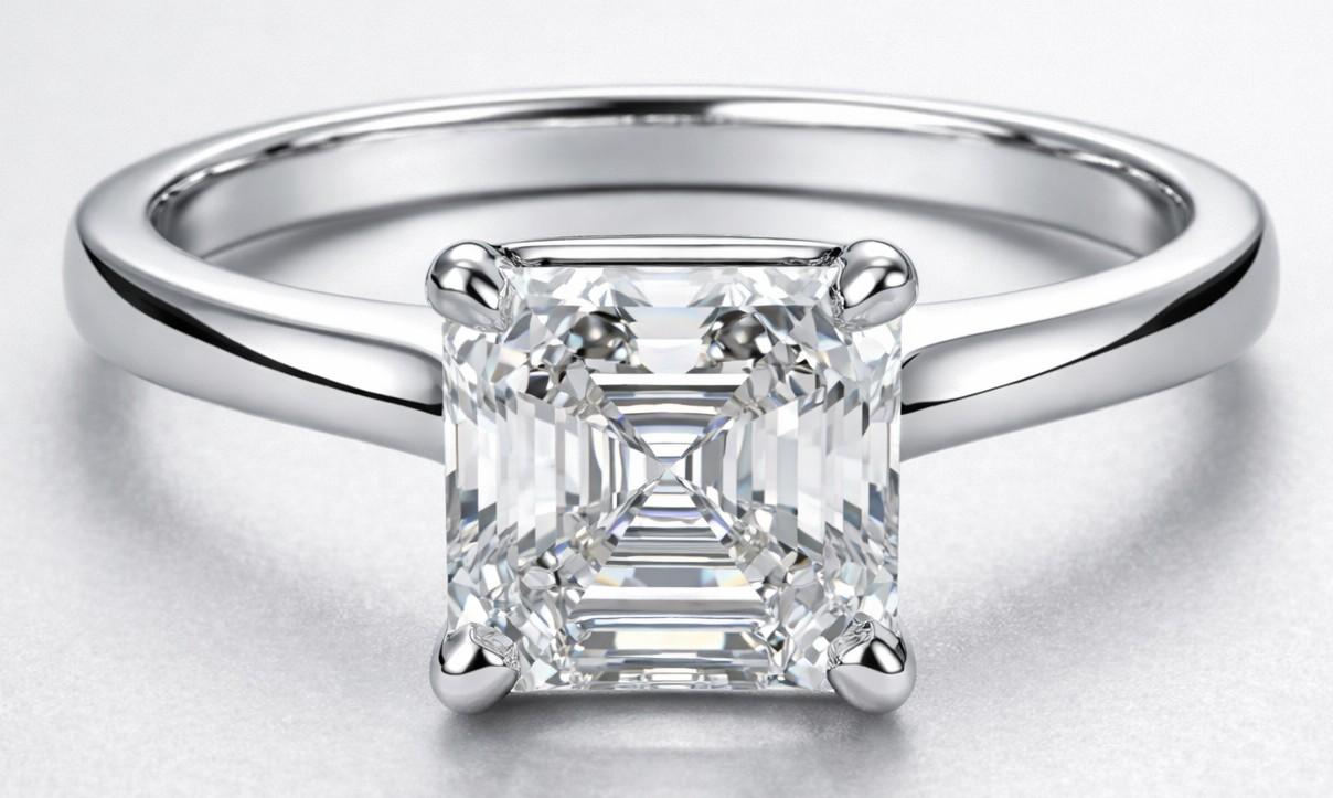 One New Asscher Cut Diamond Solitaire Ring. Mounting is Made of Sterling Silver and a Ring Size 7.