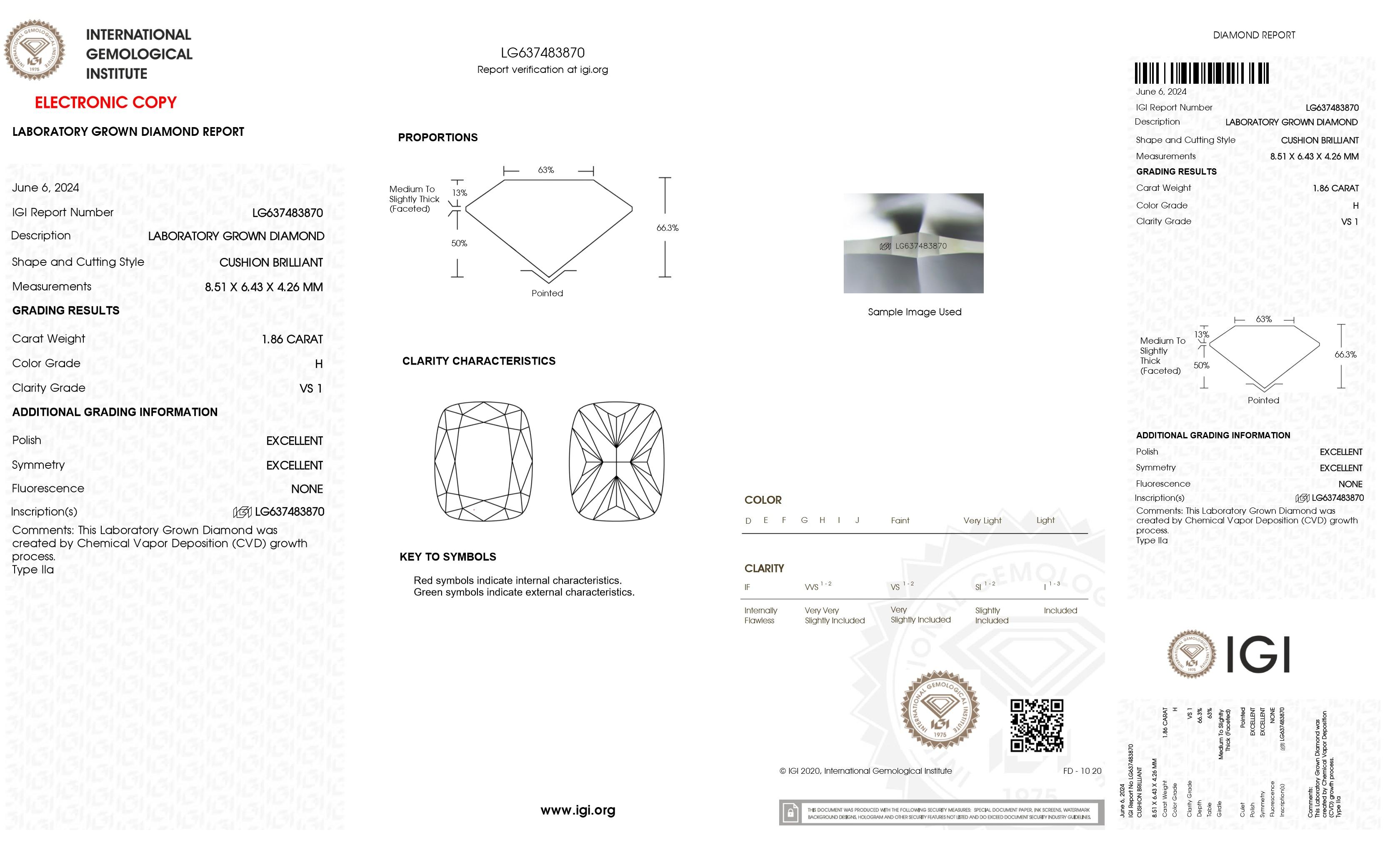 1.86 Carats Lab Grown Diamond Loose H, VS1 | $2,600 Estimated Retail Value (UGL & IGI Certs)
