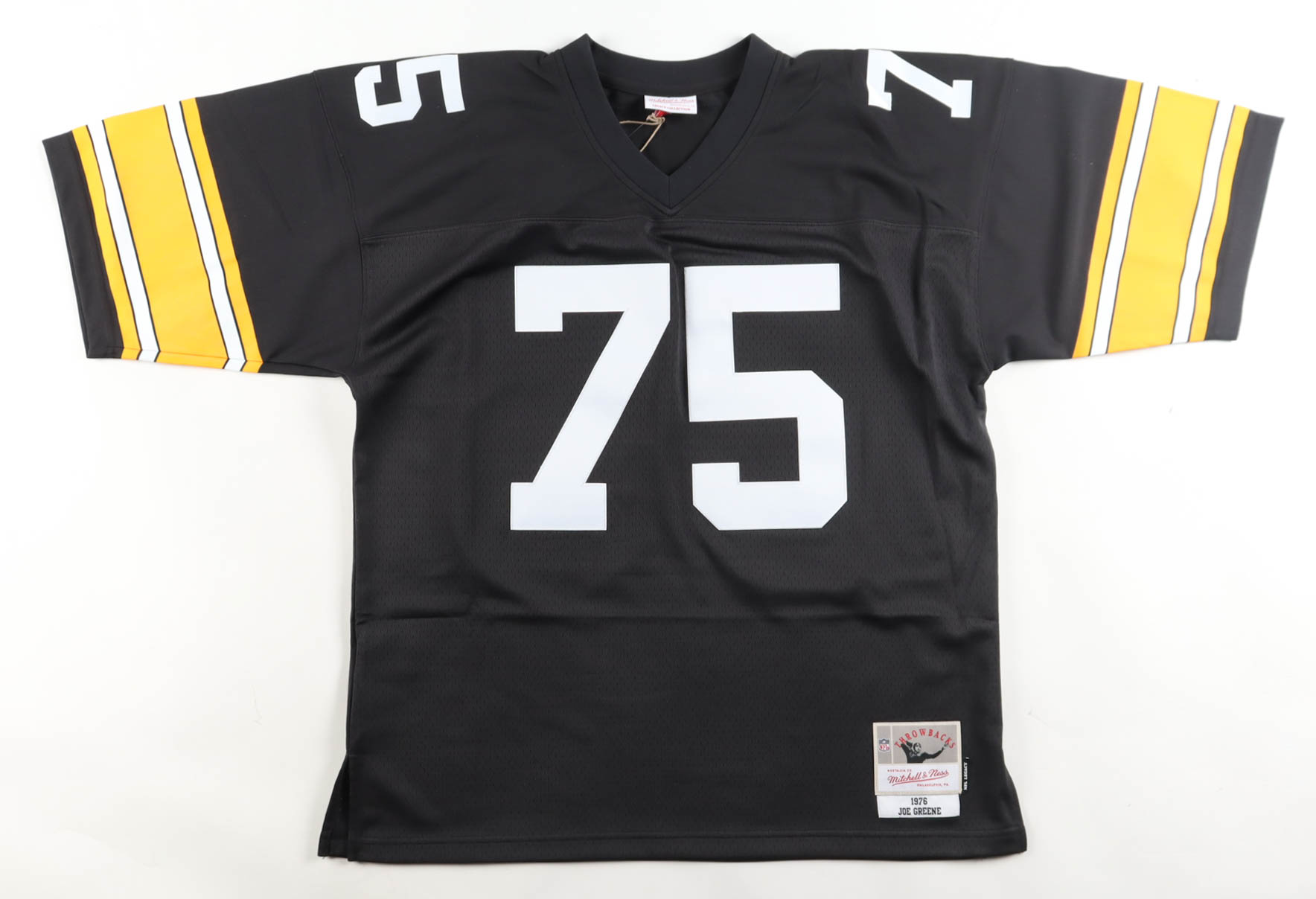 Mitchell & Ness jersey with everything sewn on, size 48 (XL). Hand-signed and inscribed by Joe Greene (Pittsburgh Steelers, HOF).