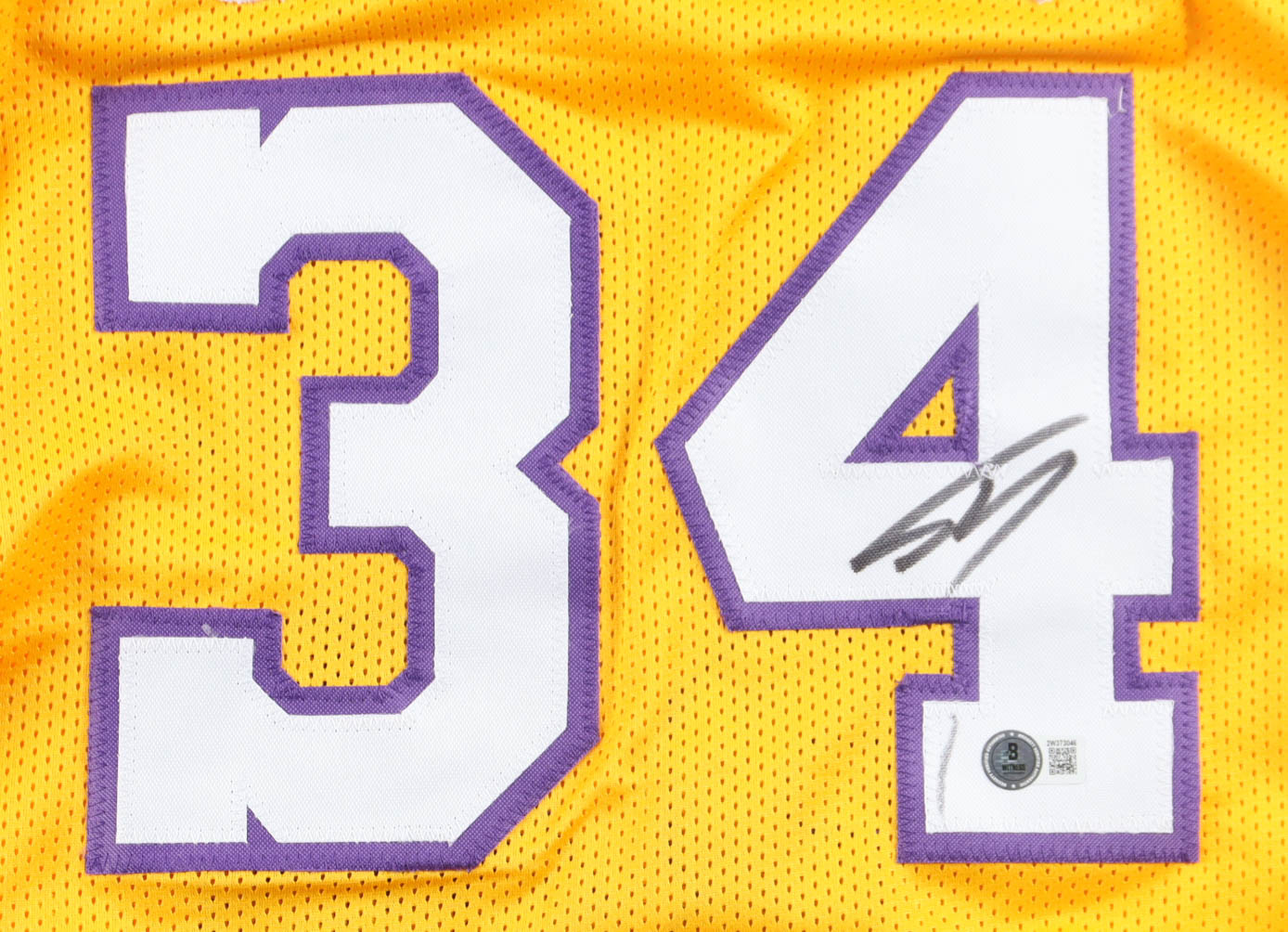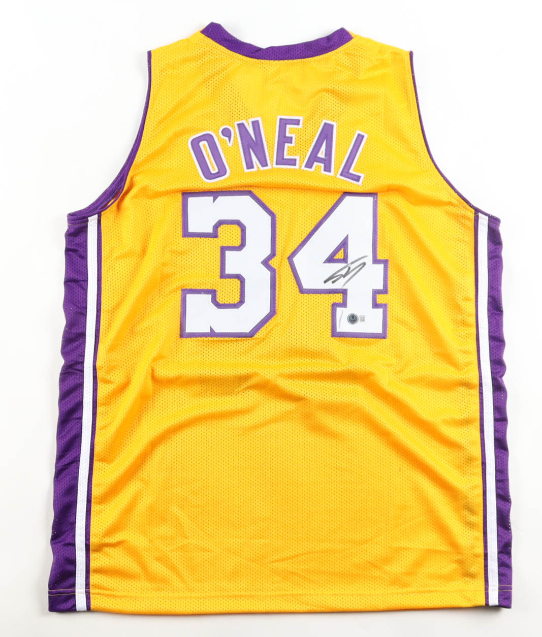 Custom jersey with everything sewn on, size XL. Hand-signed by Shaquille O'Neal (Los Angeles Lakers, HOF). Please note, there is a stray pen mark below the signature.
